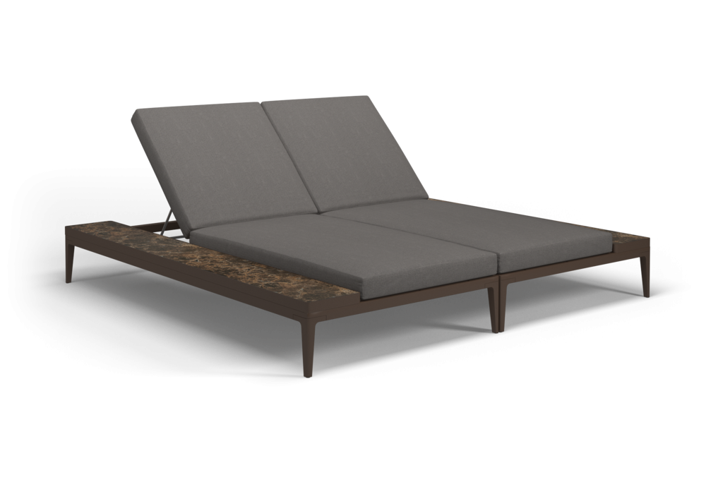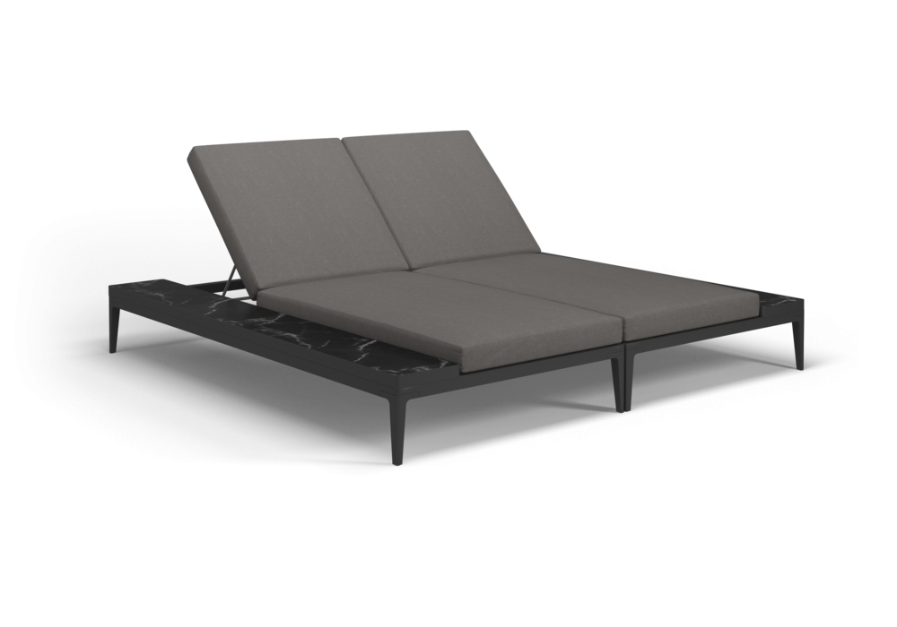 Grid, von Henrik Pedersen für Gloster entworfen, ist eine Doppel-Sonnenliege für den Außenbereich, die aus einer pulverbeschichteten Aluminiumstruktur und Teakholzplatten mit natürlicher oder keramischer Oberfläche besteht. Gepolsterter Sitz und Rückenlehne aus Outdoor-Stoff inklusive.
