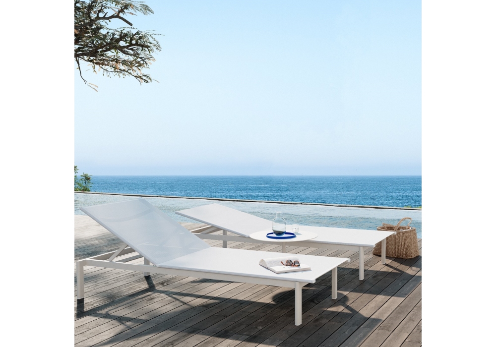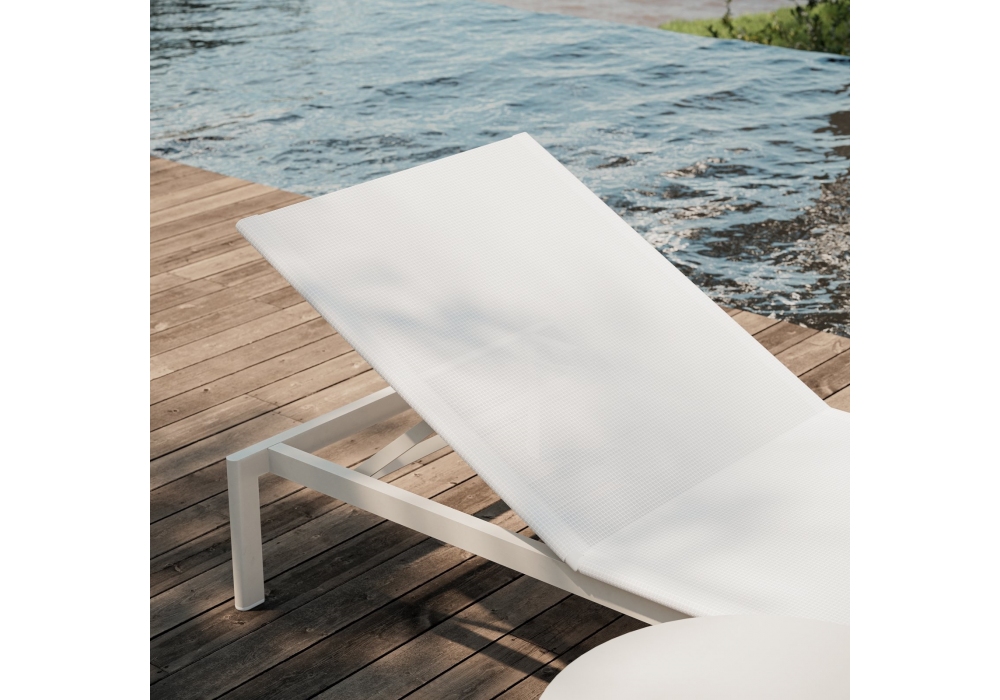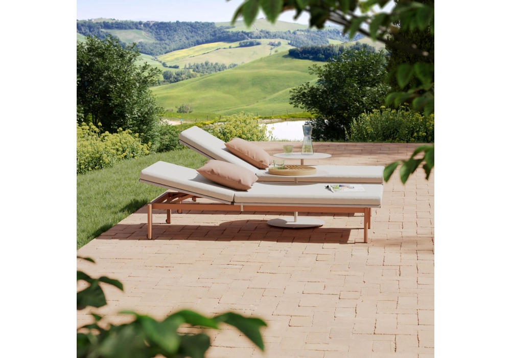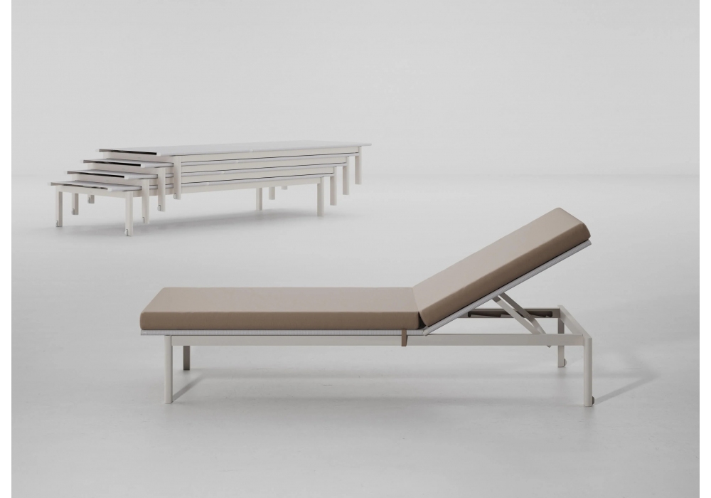 Pad entworfen und hergestellt von Kettal Studio ist eine Sonnenliege mit einem lackierten Aluminiumrahmen. Der Korpus ist vollständig mit einer Kunstfaserplatte bedeckt. Die Kissen sind gepolstert und mit einem für den Außenbereich geeigneten Stoff bezogen. Pad ist in verschiedenen Ausführungen erhältlich.