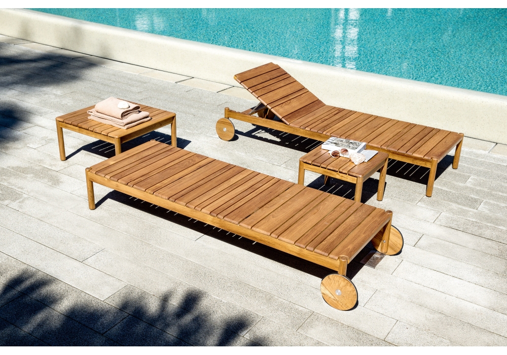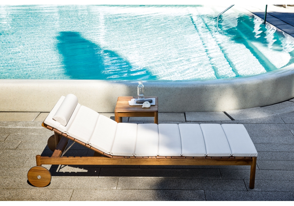 Barcode von Alessandro Dubini für Varaschin entworfen, ist eine Sonnenliege mit Struktur aus zertifiziertem Plantagenteak. Erhältlich mit Polsterung in verschiedenen Ausführungen.
