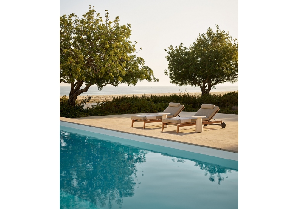 Magnolia von Emmanuel Gallina für Poliform entworfen, ist eine Sonnenliege mit Holzstruktur in Iroko natur oder schwarz gebeiztem Iroko mit mattbraun lackierten Metallteilen. Liegende Rückenlehne mit gepolstertem Verschluss. Schwarze Gummiräder mit zu den Metallteilen passender Felge. Sitz- und Rückenkissen aus recyceltem PET-Polyester mit Polyurethan-Einlage. Kopfstütze aus Polyurethan. Vorbespannung aus Polyesterfaser mit heißversiegelten Nähten. Abnehmbarer Stoffbezug.