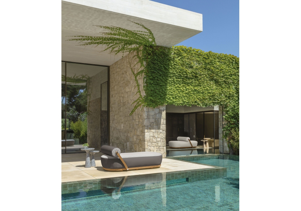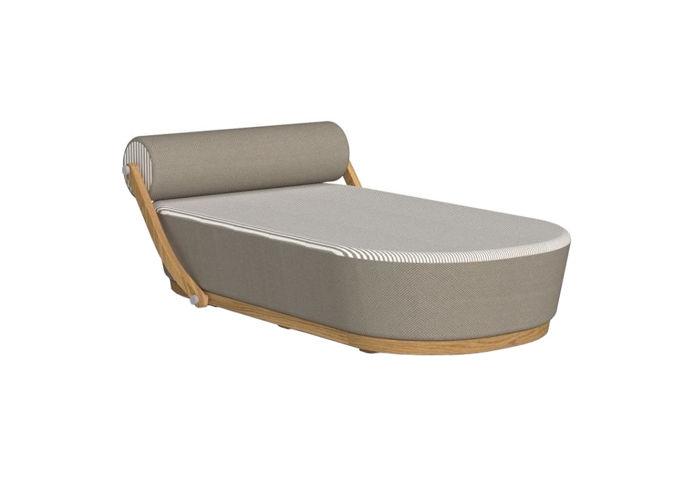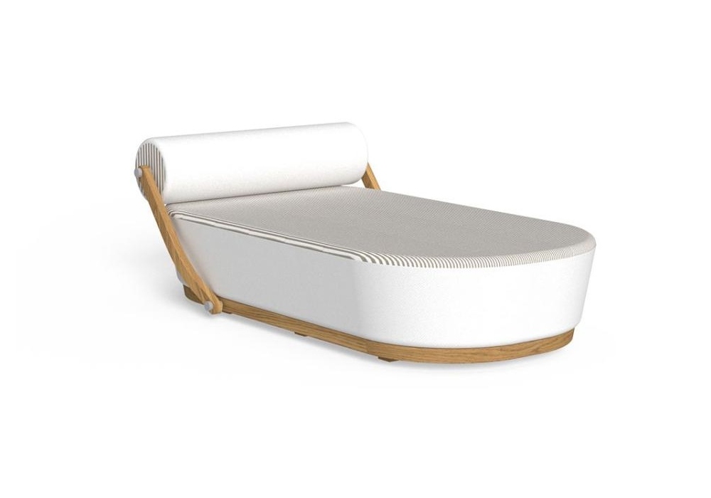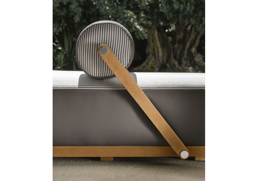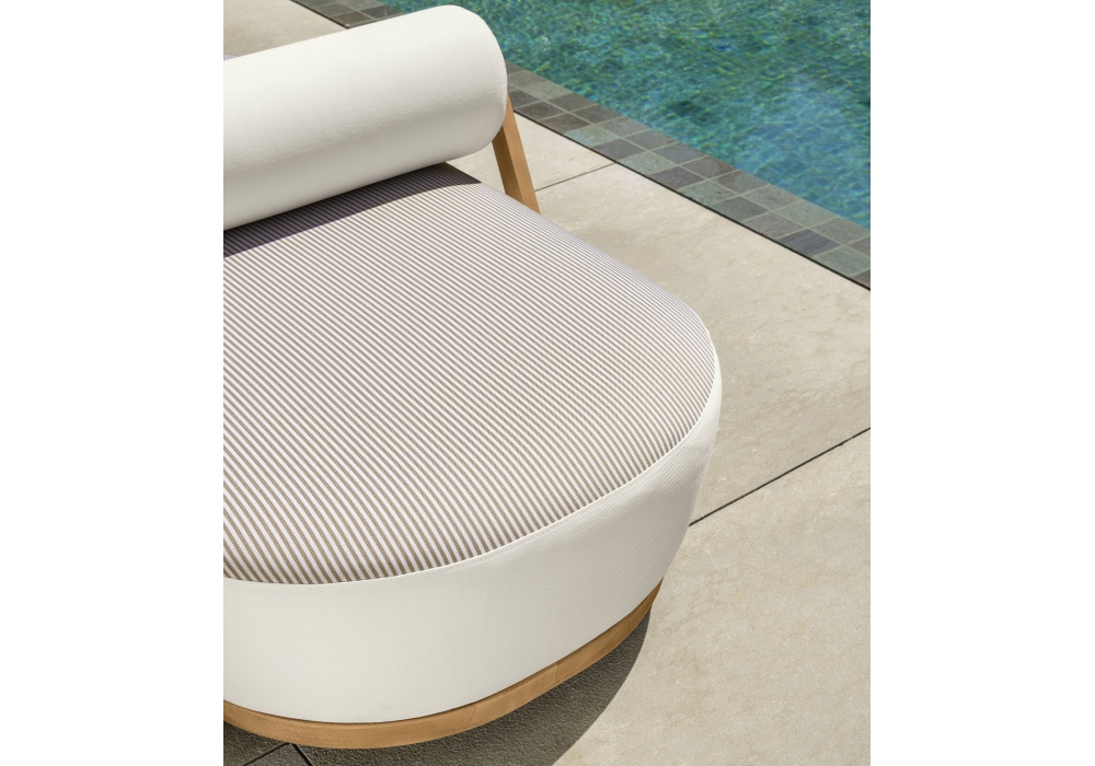 Nami von Teresa Sapey für Talenti entworfen, ist eine Sonnenliege aus Holz mit Stoffbezug. Erhältlich in verschiedenen Ausführungen.
