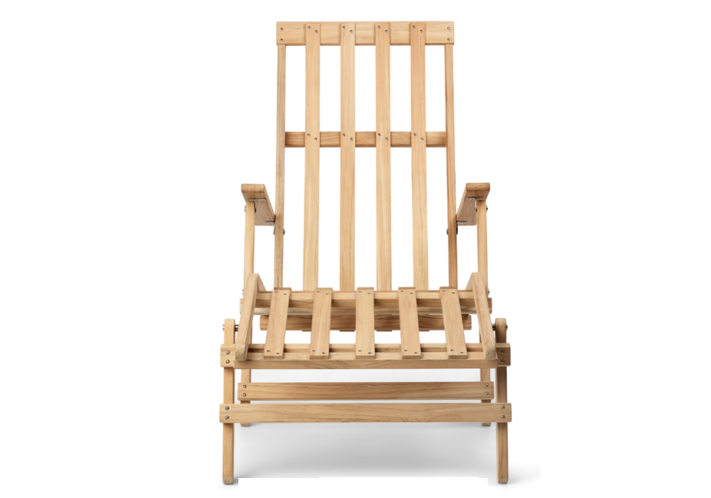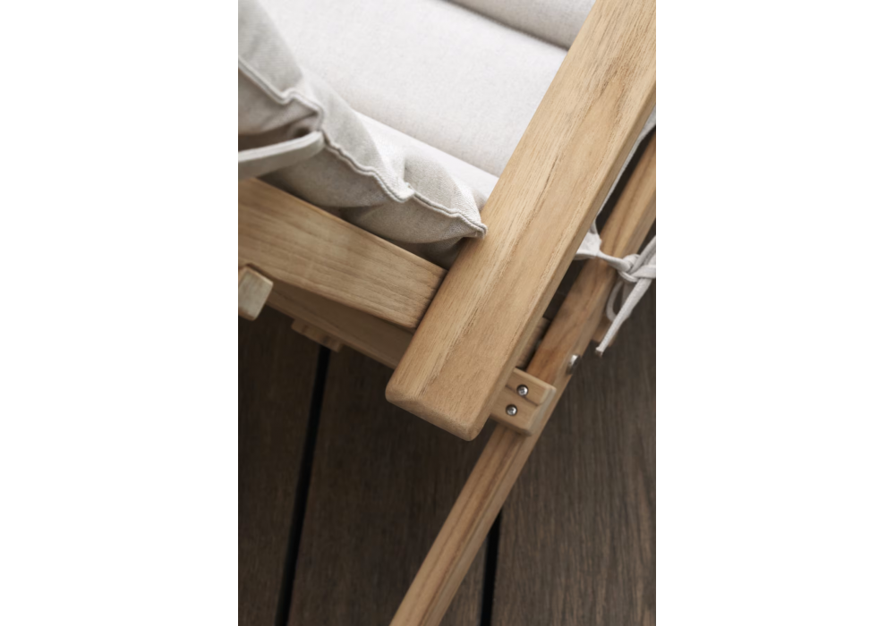 BM5565 BM von BøRge Mogensen für Carl Hansen & Søn entworfen, ist ein klappbarer Liegestuhl aus massivem, unbehandeltem Teakholz. Sitzkissen aus Stoff Heritage Papyrus 18006.
