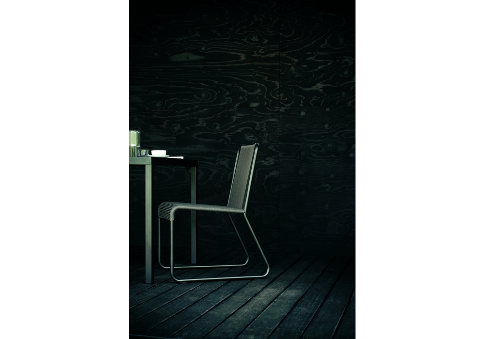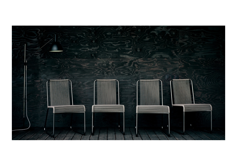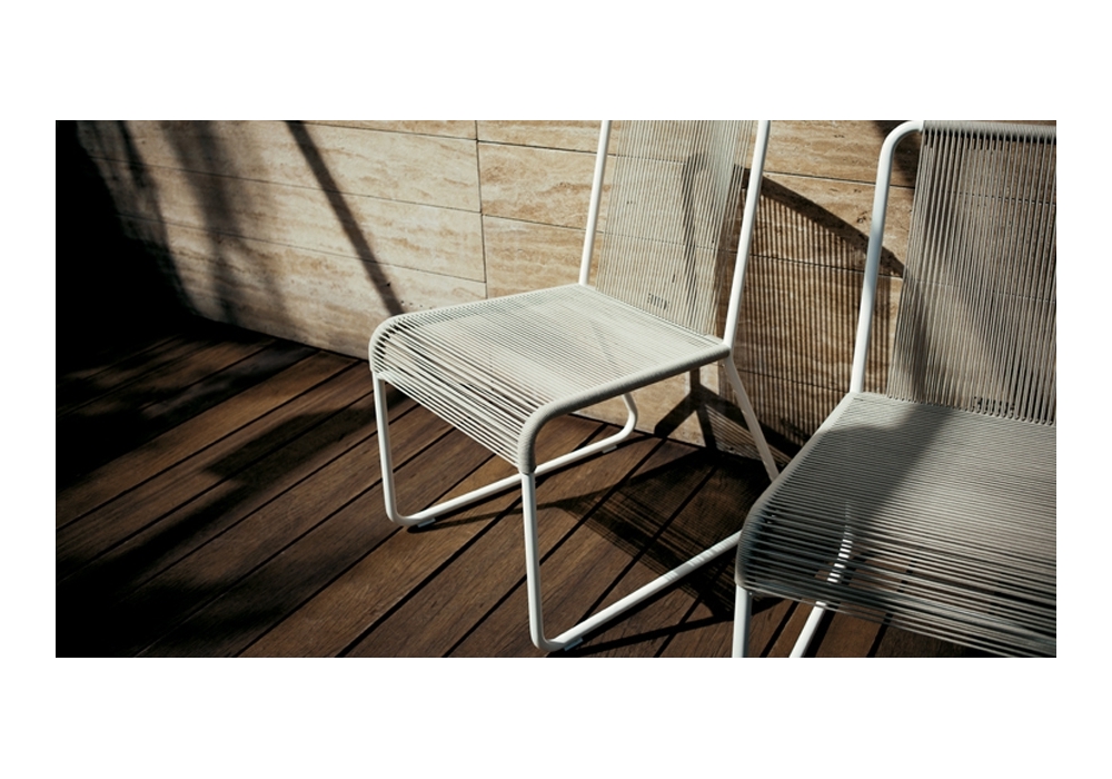 Harp 349 is an outdoor chair designed by Rodolfo Dordoni for Roda. The classic string chair finds a new outdoor dimension, where polyester trails its infinite filaments around a tubular stainless steel structure in one continuous outline. Harp is a celebration of a craft manufacturing: a never-ending weave of cords that twine the stainless steel frame drawing lines that look continuous to the human eye. The structure, made in painted stainless steel welded by hand, and the cords, in a double polyester twisted thread with a cotton finishing.