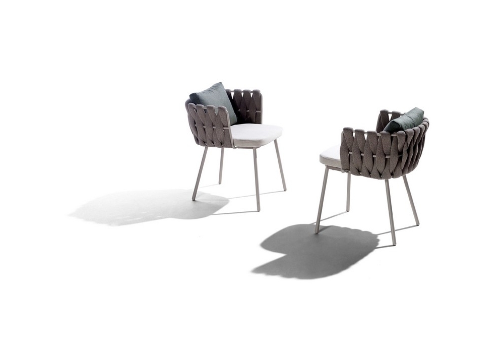 Tosca, von Monica Armani für Tribù entworfen, ist ein Stuhl mit Struktur aus pulverbeschichtetem Edelstahl und gewebter Rohrpolsterung aus Textilene und Polyolefin. Die Sitz- und Rückenkissen sind in verschiedenen Polsterarten und -farben erhältlich.