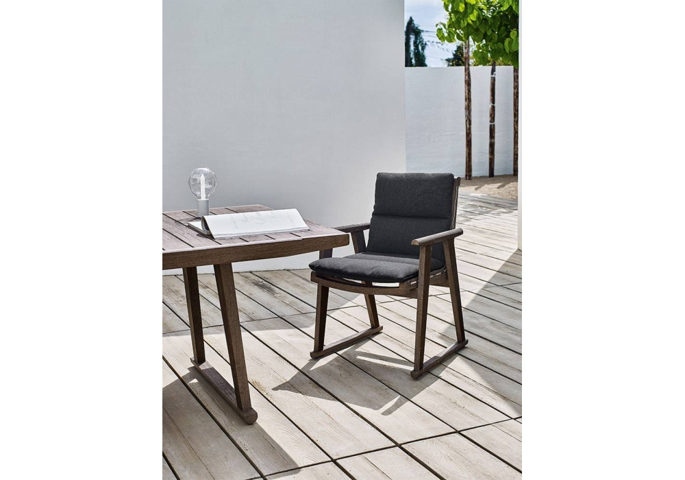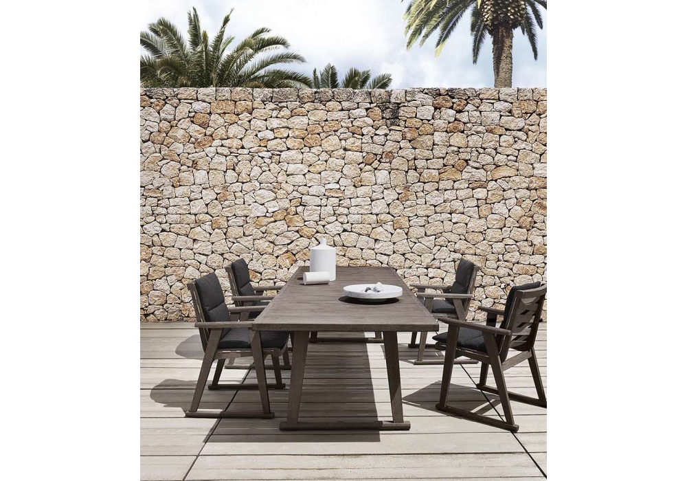 Gio von Antonio Citterio für B&B Italia Outdoor entworfen, ist ein Stuhl mit Armlehnen und einer Struktur aus massivem Teakholz in antikgrauem Finish, taubengrauen Polypropylenbändern. Polsterung in verschiedenen Stoffen.