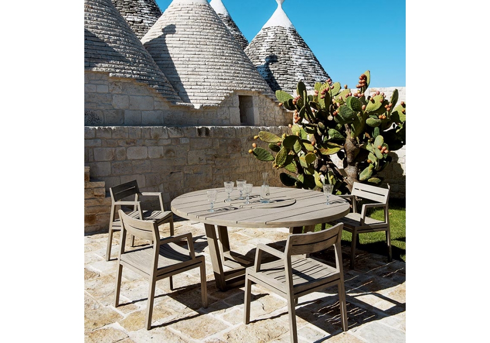 Costes von Ethimo entworfen, ist ein Stuhl mit Struktur aus Teakholz und Sitzkissen in Acrylgewebe, verfügbar in verschiedenen Farben.