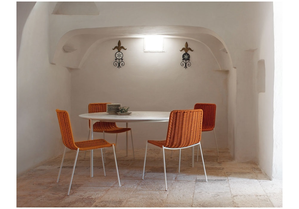 Kiti von Francesco Rota für Paola Lenti entworfen, ist ein Stuhl mit einer Struktur aus mattem oder glänzend lackiertem Edelstahl in verschiedenen Farben. Feste handgewebte Abdeckung in Seil- oder Aquatechschnur erhältlich. Auf Anfrage ist es möglich, eine herausnehmbare Matratze in verschiedenen Stoffen und Farben zu kombinieren.