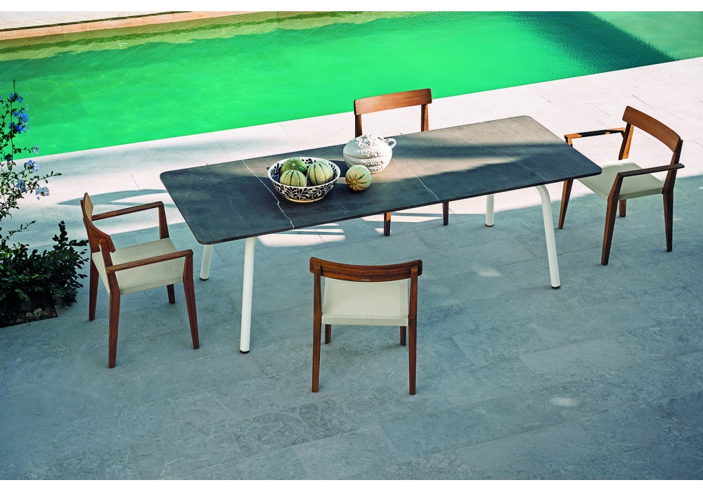 Teka, von Gordon Guillaumier für Roda entworfen, ist einer Tisch realisiert mit Teakholz Struktur und Sitz mit Canatex Netz. Die Vermischung der verschiedenen Materialien strahlt alle ausdrucksvolle Kraft des Teakholzes, die mit Canatex Stoffen für die Sitze gemischt wird. Die Teka-Kollektion besteht aus modularen Sofas, Stühlen, Sesseln, Esstischen und Couchtischen. Auch mit Armlehnen lieferbar.