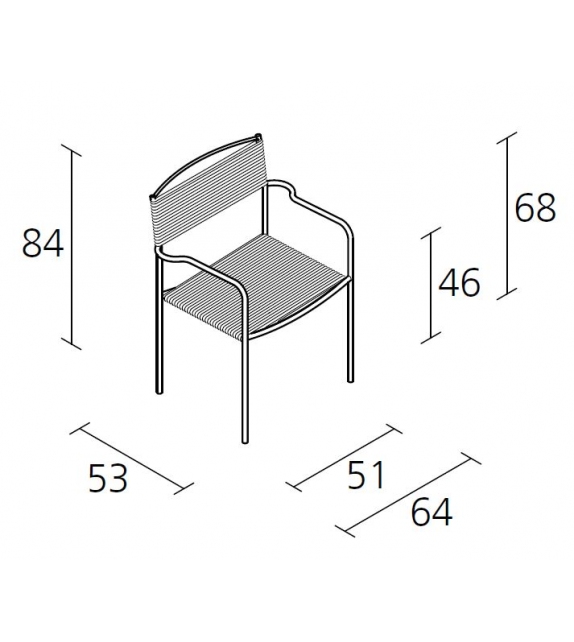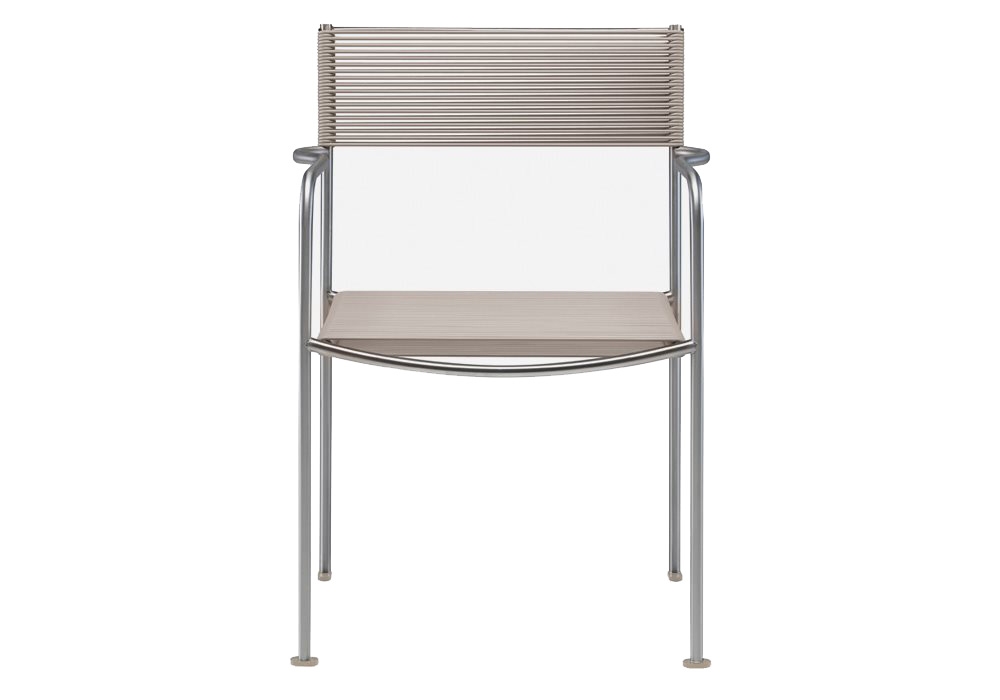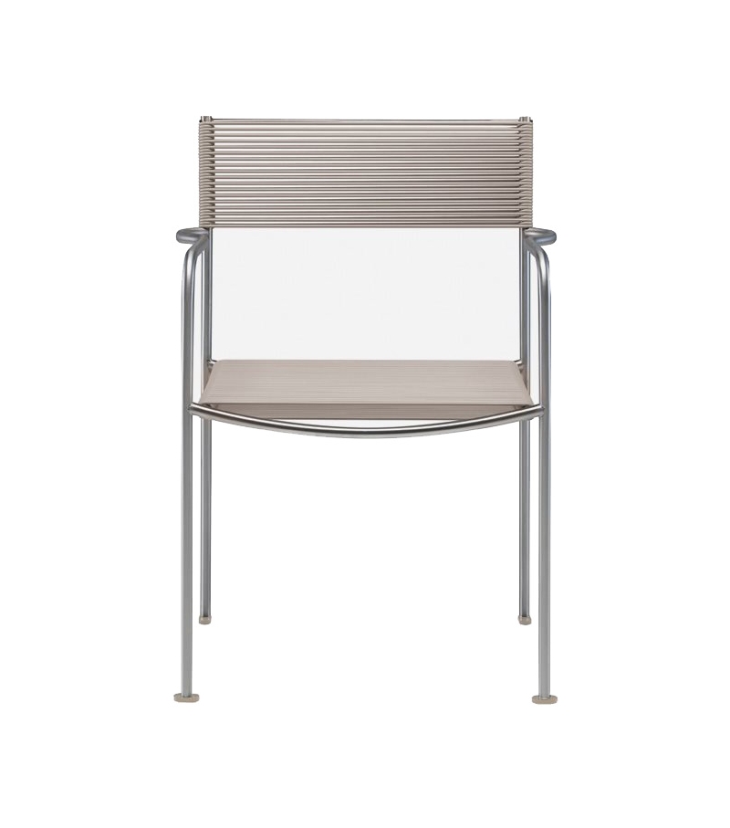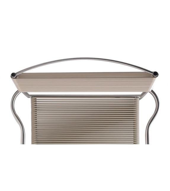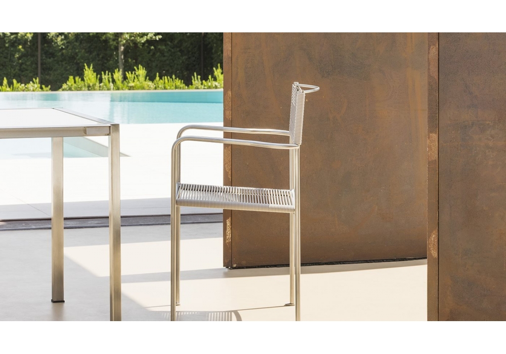 Green PVC 201 entworfen von Giandomenico Belotti für Alias ist ein Stuhl für den Außenbereich mit Armlehnen. Es besteht aus gebürstetem Edelstahl, Sitz und Rückenlehne aus PVC Ø5 mm. Erhältlich in verschiedenen Ausführungen.