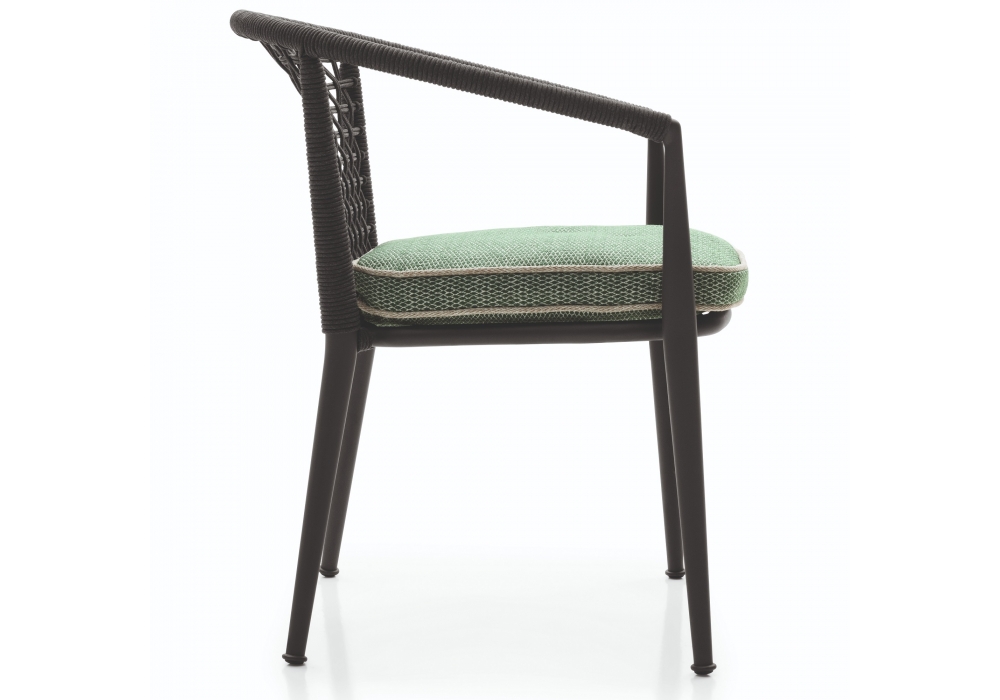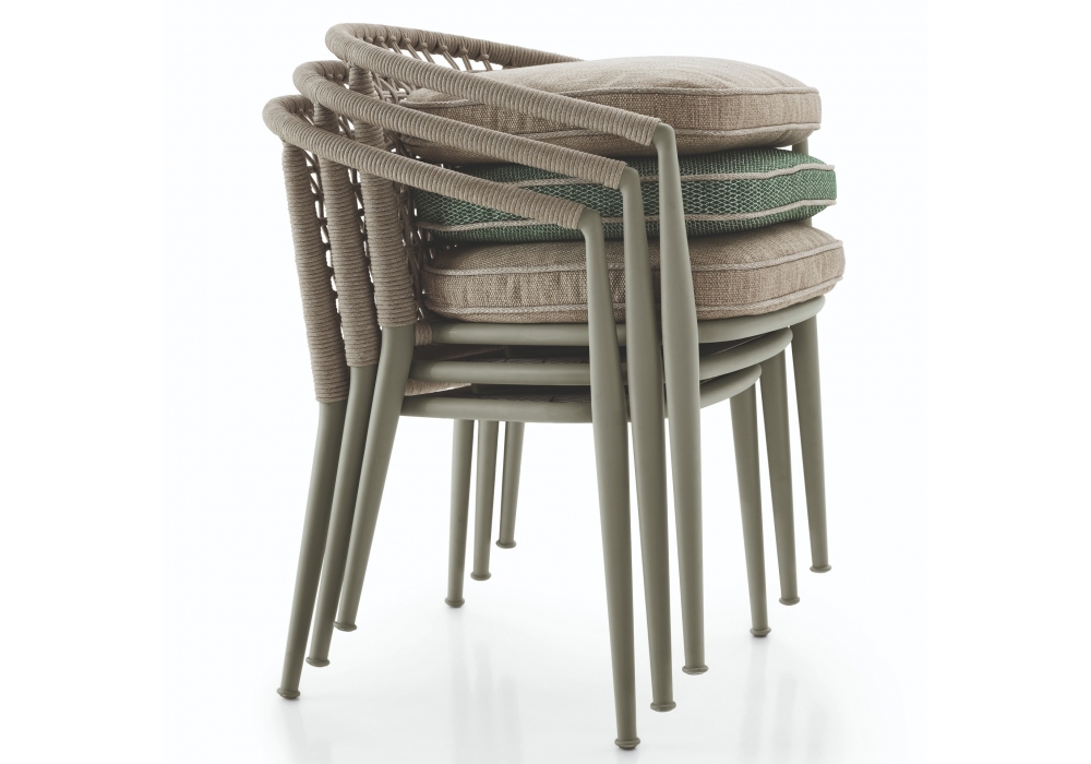 Erica '19 von Antonio Citterio für B&B Italia Outdoor entworfen, ist ein Outdoor-Stuhl mit einem Gestell aus lackiertem Aluminium und einem Geflecht aus Polypropylenfasern. Polsterung in verschiedenen Stoffen.