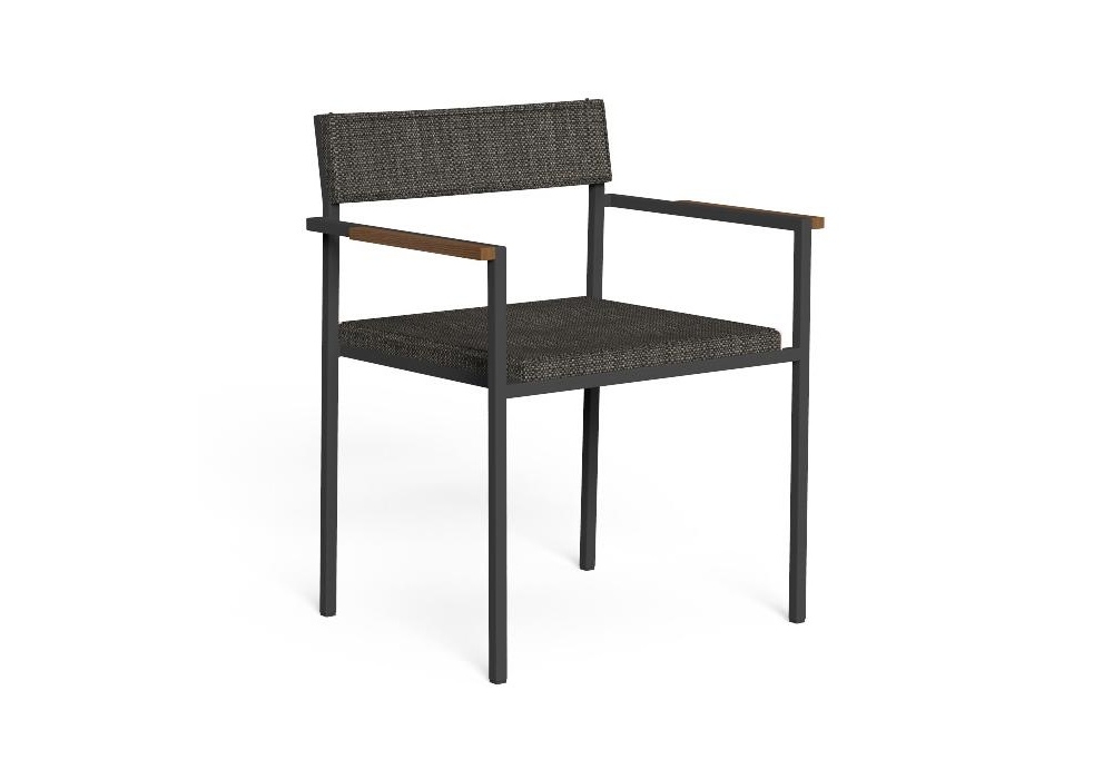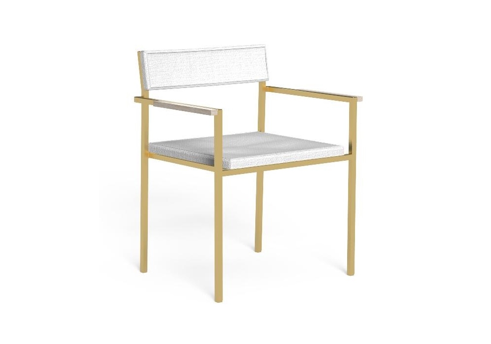 Casilda ist ein Stuhl mit Armlehnen, den Ràmon Esteve für Talenti entworfen hat. Bestehend aus einem pulverbeschichteten Metallrahmen, Polyesterbändern entlang der Struktur, mit Stoff bezogenem Kissen und Armlehnen aus verschiedenen Materialien.
