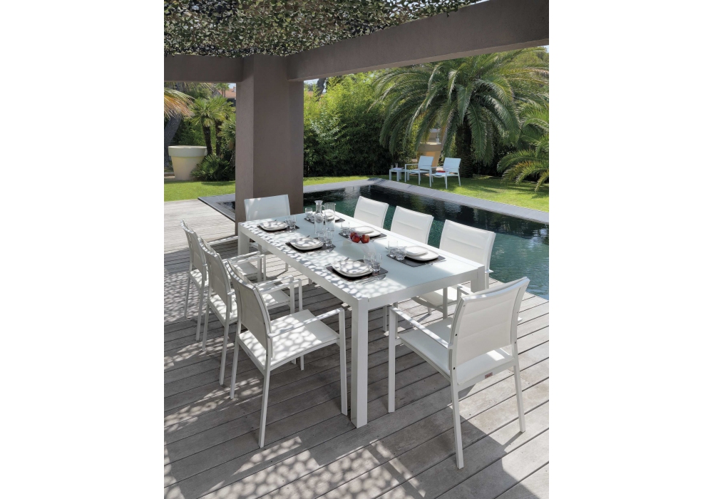 Touch für Talenti entworfen, ist ein Outdoor-Stuhl mit Aluminiumstruktur und Textilene-Sitz, der in vier Ausführungen erhältlich ist.