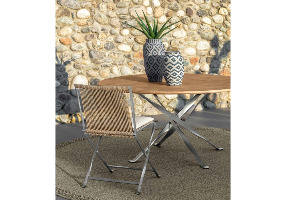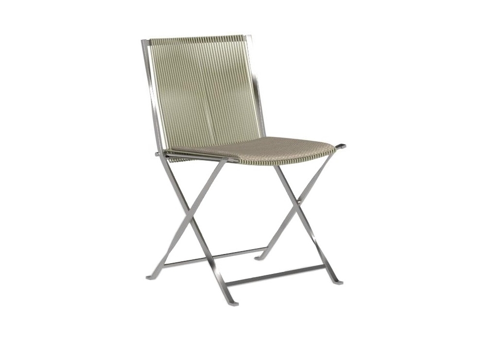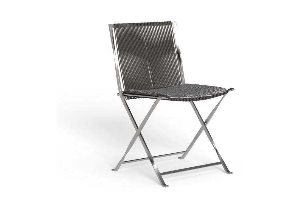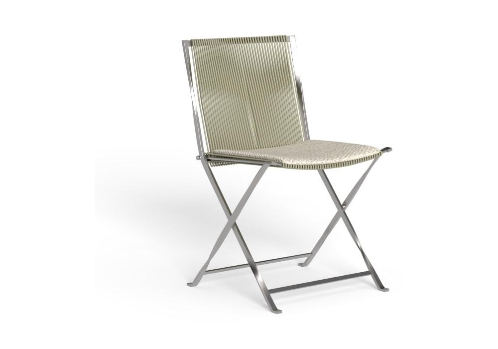 George von Ludovica + Roberto Palomba für Talenti entworfen, ist ein Klappstuhl für den Außenbereich mit Struktur aus Edelstahl. Sitzfläche und Rückenlehne sind mit einem Geflecht aus synthetischen Seilen bespannt.