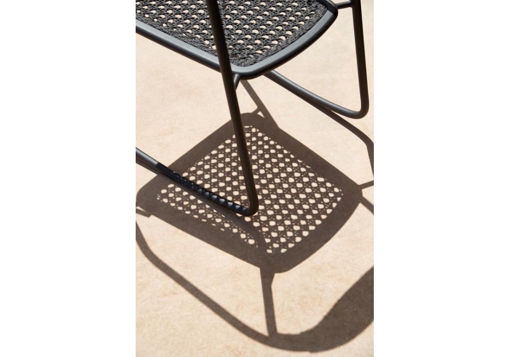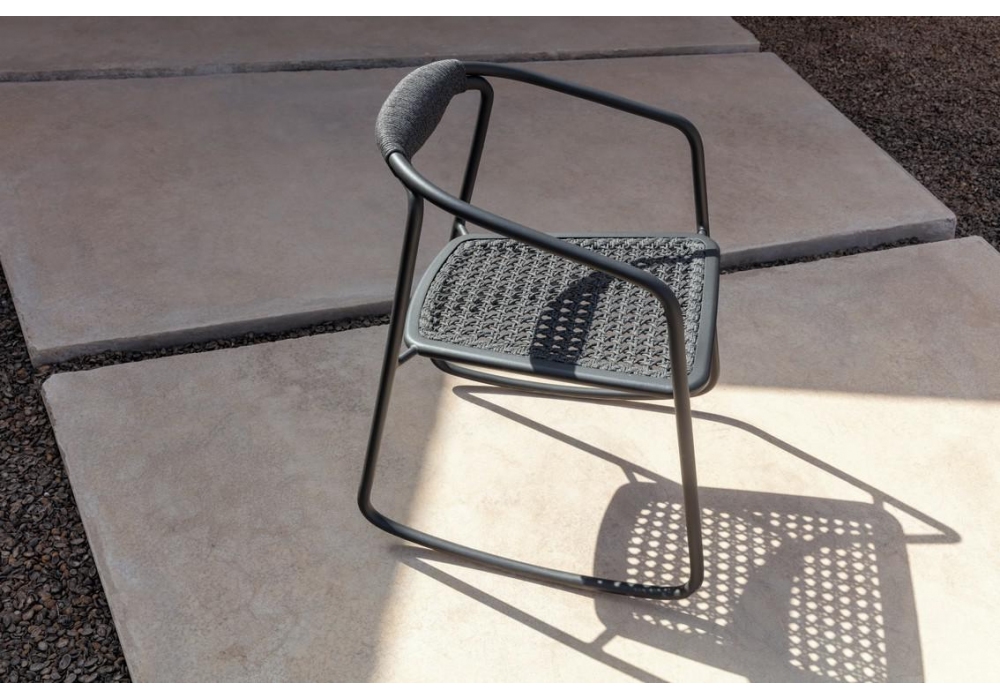 Duo, von Koen Van Extergem für Manutti entworfen, ist ein Outdoor-Schaukelstuhl, der aus zwei gefalteten Aluminiumstrukturen besteht, die scheinbar von Seilen zusammengehalten werden. Polsterung der Kissen in Stoff. Erhältlich in verschiedenen Ausführungen.