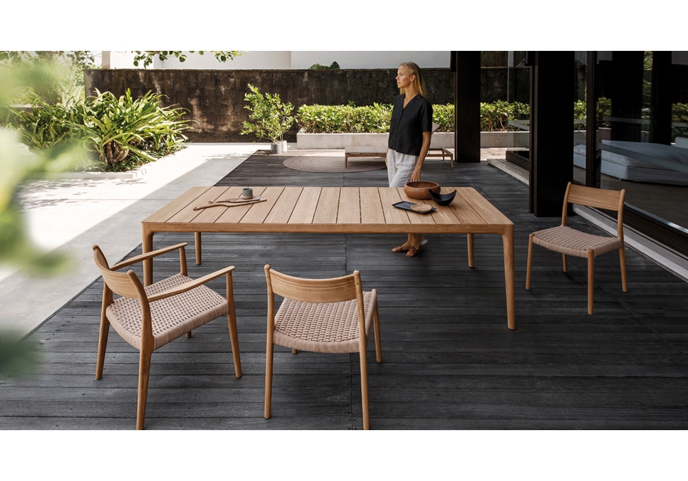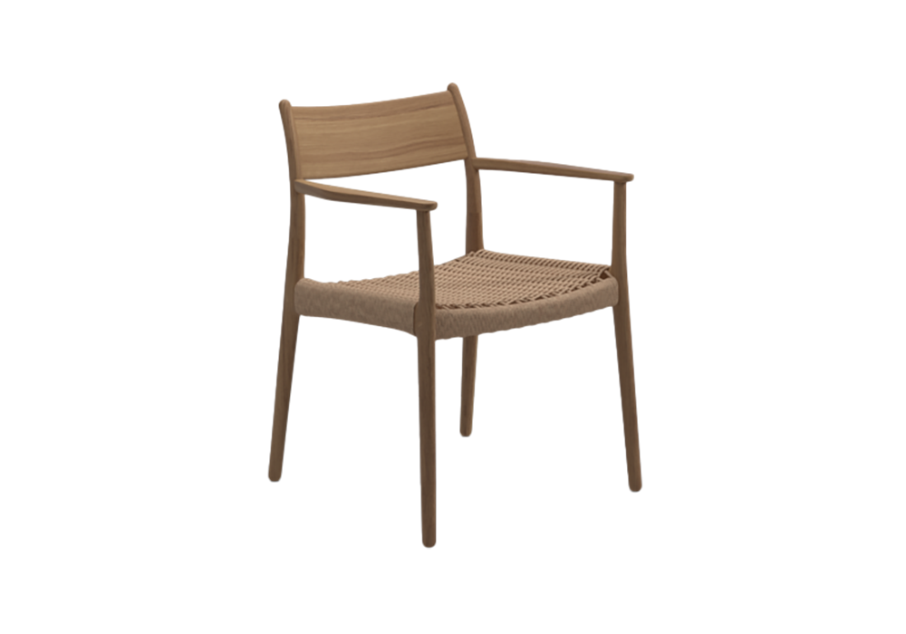 Lima von Henrik Pedersen für Gloster entworfen, ist ein Stuhl mit Struktur aus Teakholz mit natürlichem Finish. Weizenfarbener Sitz aus geflochtenem Korbgeflecht. Erhältlich in zwei Versionen.