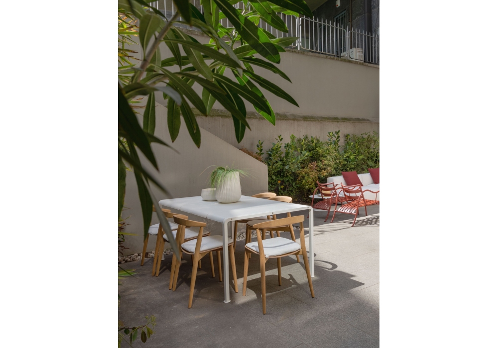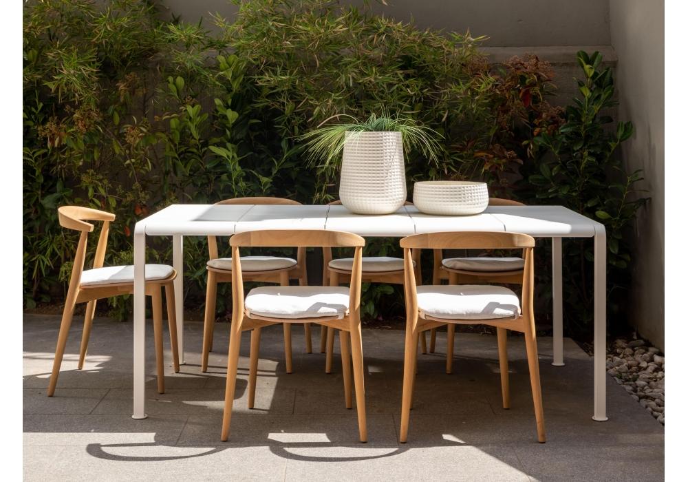 Newood Light Lido von Brogliato Traverso für Cappellini entworfen, ist ein stapelbarer Stuhl mit einer Struktur aus massivem Iroko. Möglichkeit, ein abnehmbares Sitzkissen aus Stoff hinzuzufügen.