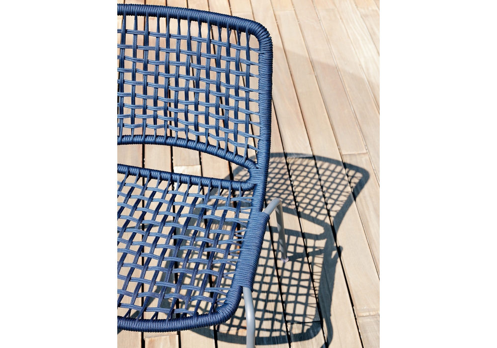 Egao von Toan Nguyen für Potocco entworfen, ist ein Outdoor-Stuhl mit Beinen aus lackiertem Edelstahlrohr und Geflecht aus mokkafarbener synthetischer Kordel oder Seil.