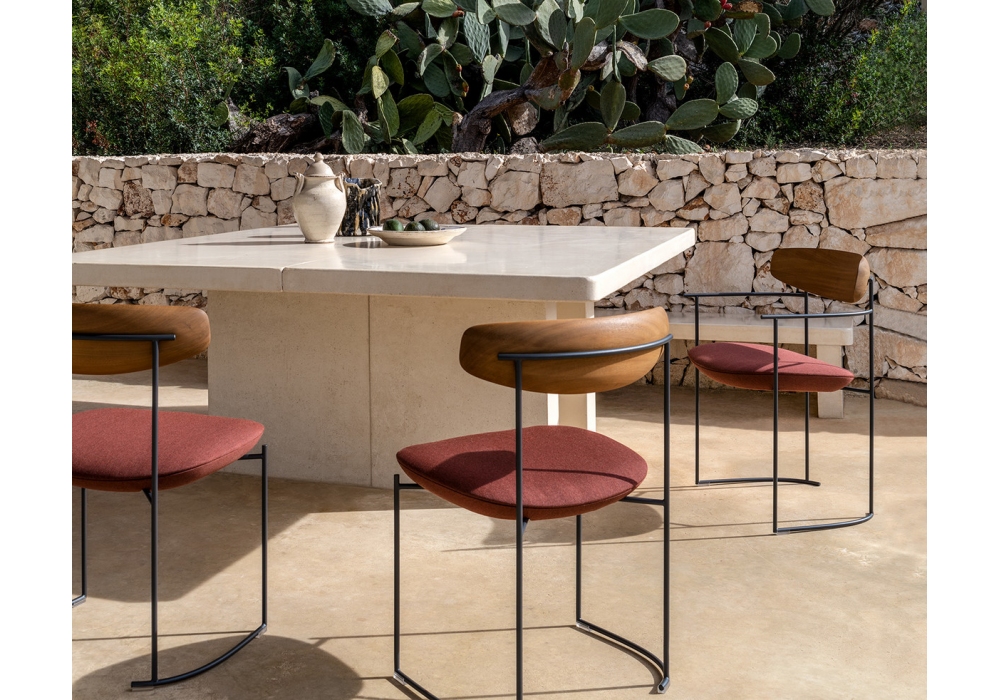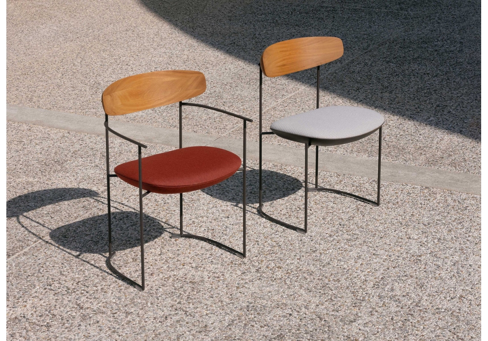 Keel Outdoor von M + V für Potocco entworfen, ist ein Outdoor-Stuhl mit einer Struktur aus geprägtem, lackiertem Metallstab, einer Rückenlehne aus massivem Iroko und einer Sitzpolsterung aus feuerhemmendem Polyurethanschaum mit Bezug aus verschiedenen Outdoor-Stoffen. Verfügbar mit oder ohne Armlehnen.