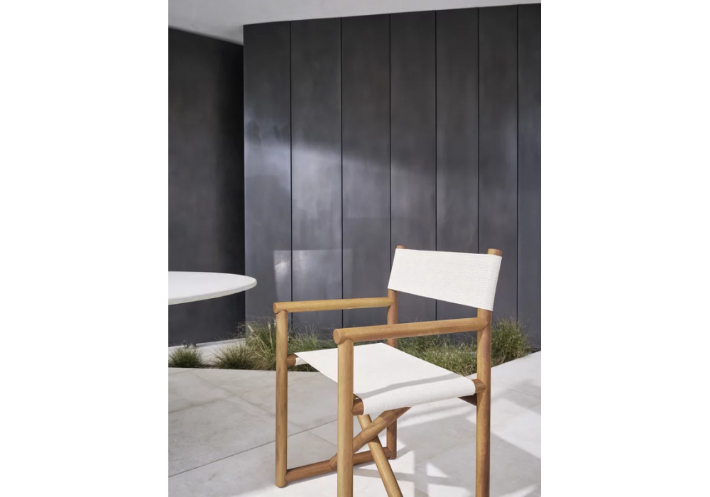 Hashi von Federica Biasi für Gervasoni entworfen, ist ein Stuhl mit Armlehnen mit einer Struktur aus geöltem Iroko-Holz oder Teakholz, Sitz/Rückenlehne aus blauem oder beigem Jacquard-Accardi-Stoff.