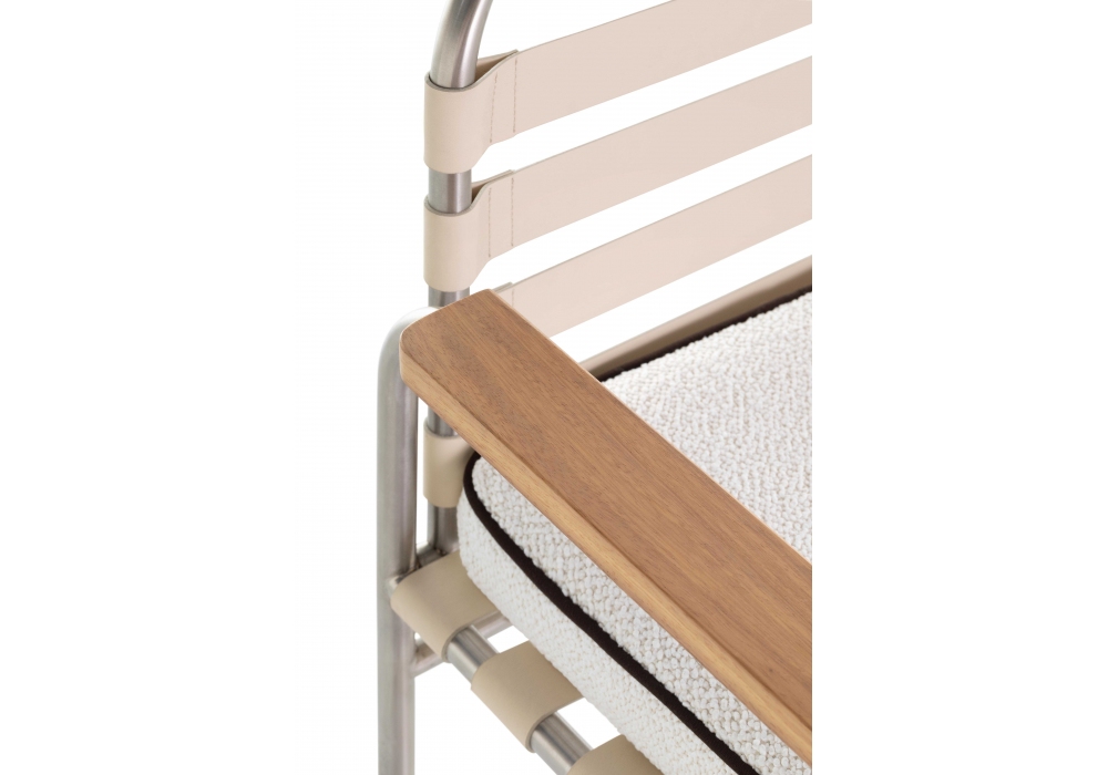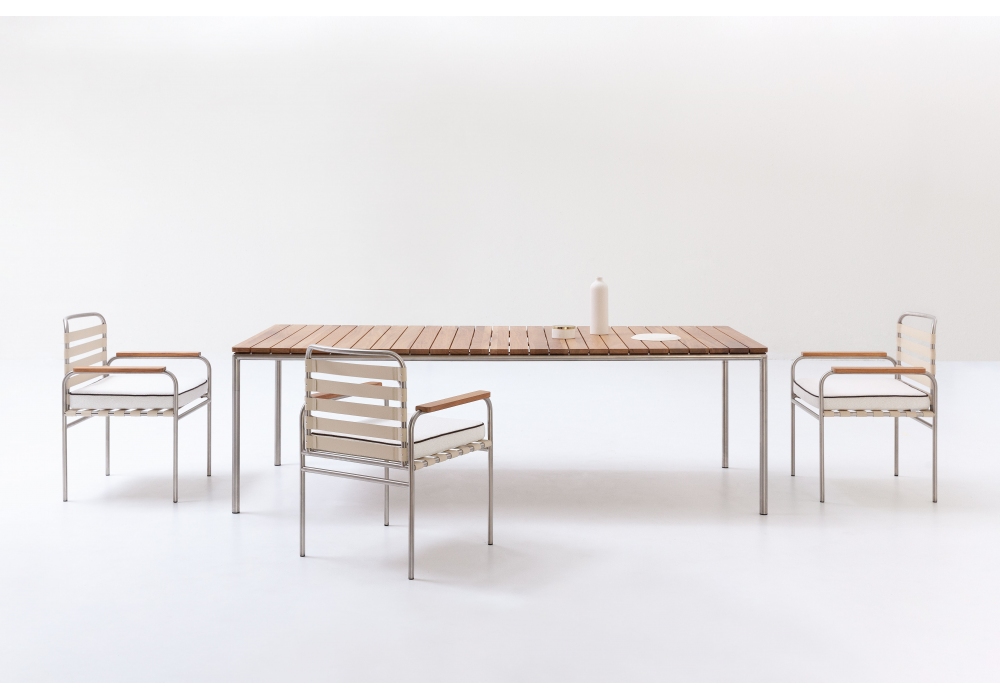 Onsen von Francesco Meda und David Quincoces für Gandia Blasco entworfen, ist ein Stuhl mit einem Edelstahlrahmen und Armlehnen aus Iroko-Holz. Kissen sind im Lieferumfang enthalten. In verschiedenen Ausführungen erhältlich.