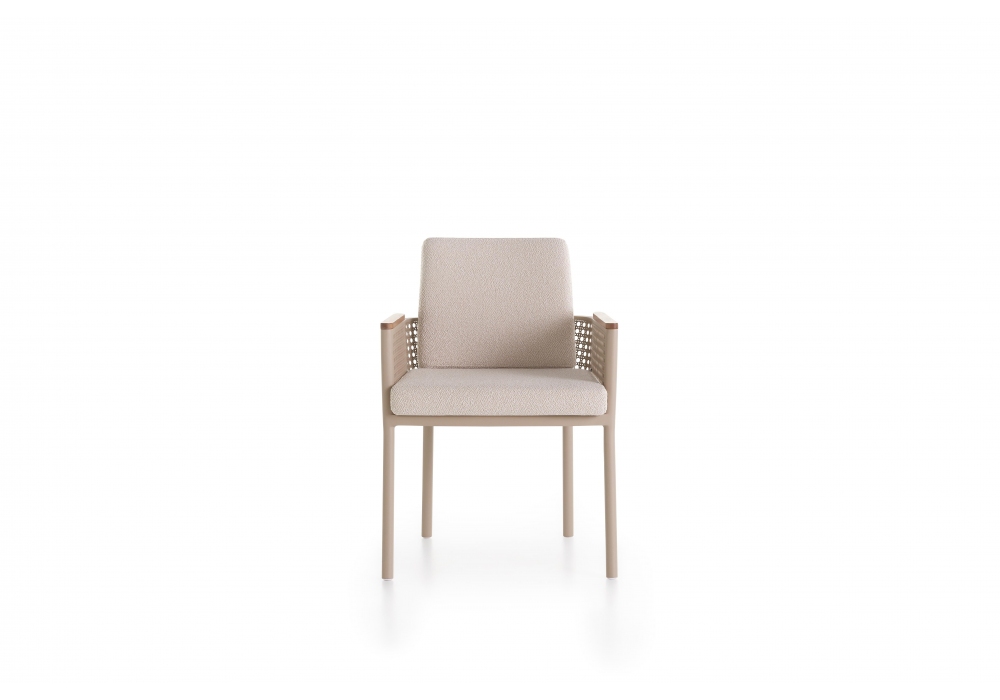 Bosc von Made Studio für Gandia Blasco entworfen, besteht aus thermolackiertem Aluminium, Armlehnen aus Irokoholz und einer Polsterung aus Polyurethan-Gummi mit wasserdichten Polyesterfasern und ist ideal für den Außenbereich. Kissen sind im Lieferumfang enthalten. Erhältlich in verschiedenen Ausführungen.