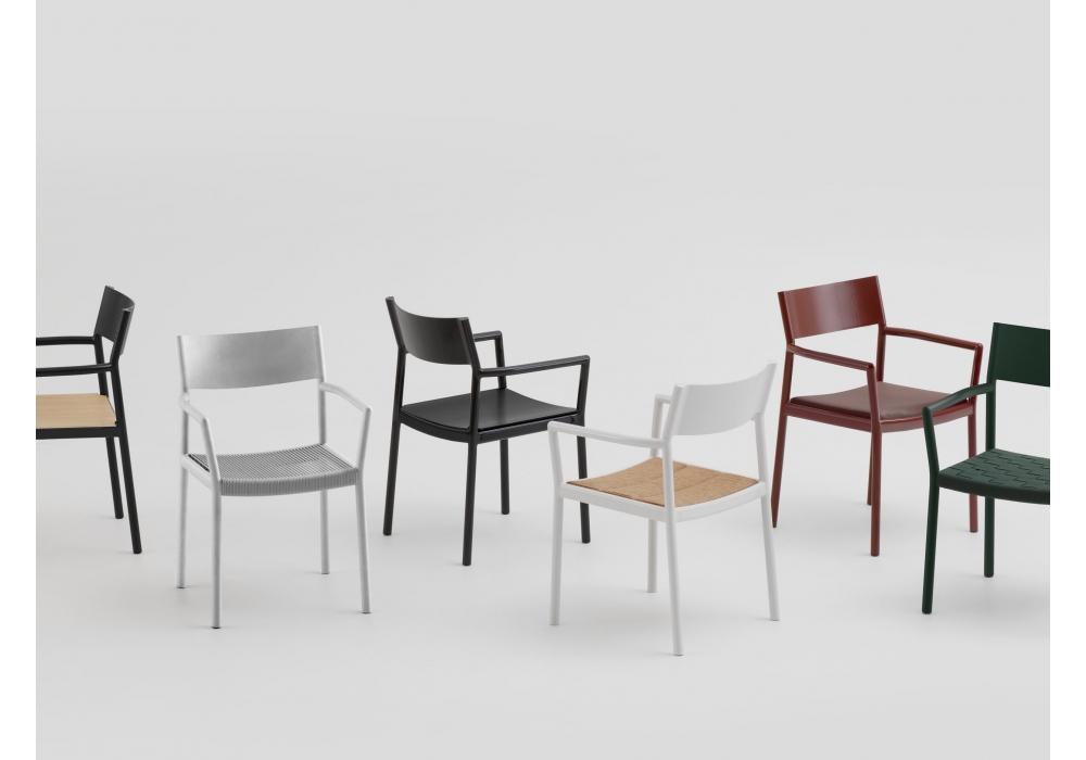 Passage Outdoor von Ronan Bouroullec für Kettal entworfen, ist ein Gartenstuhl mit Metallrahmen in glänzender oder strukturierter Ausführung. Die Sitzfläche besteht aus Aluminium, Papyrus oder Seil in der gleichen Farbe wie der Rahmen.