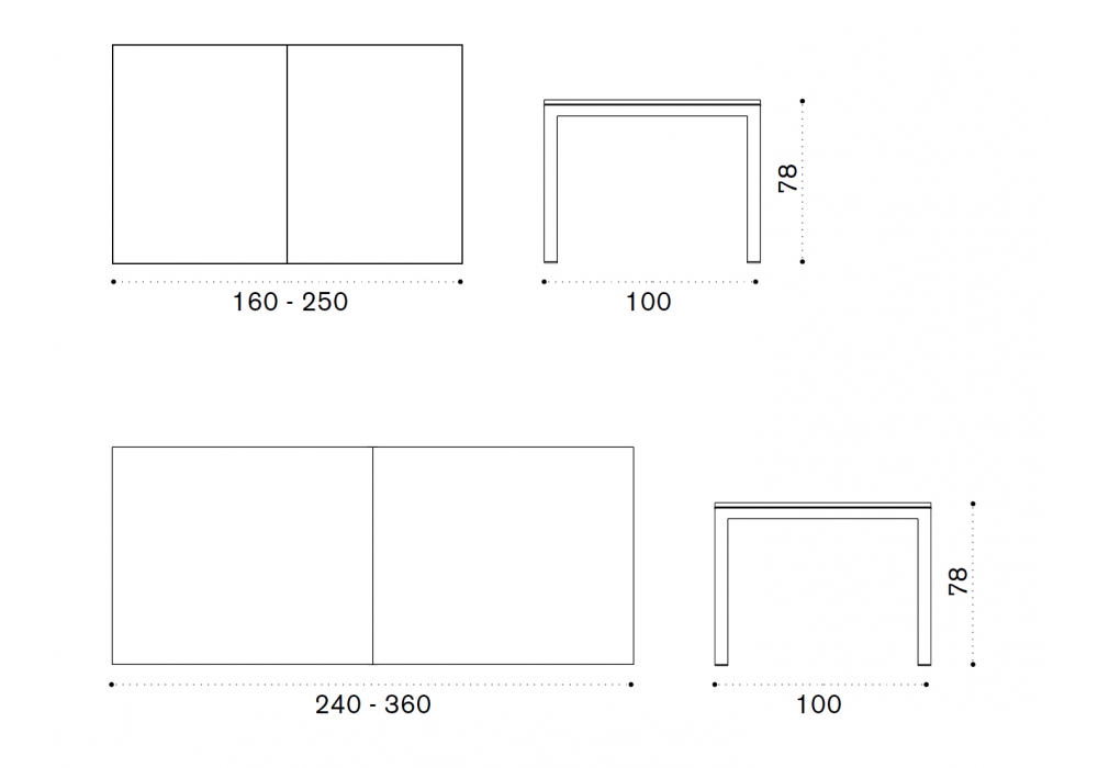 | Abmessungen | 160-250 x 100 x H 78 cm; 240-360 x 100 x H 78 cm. |