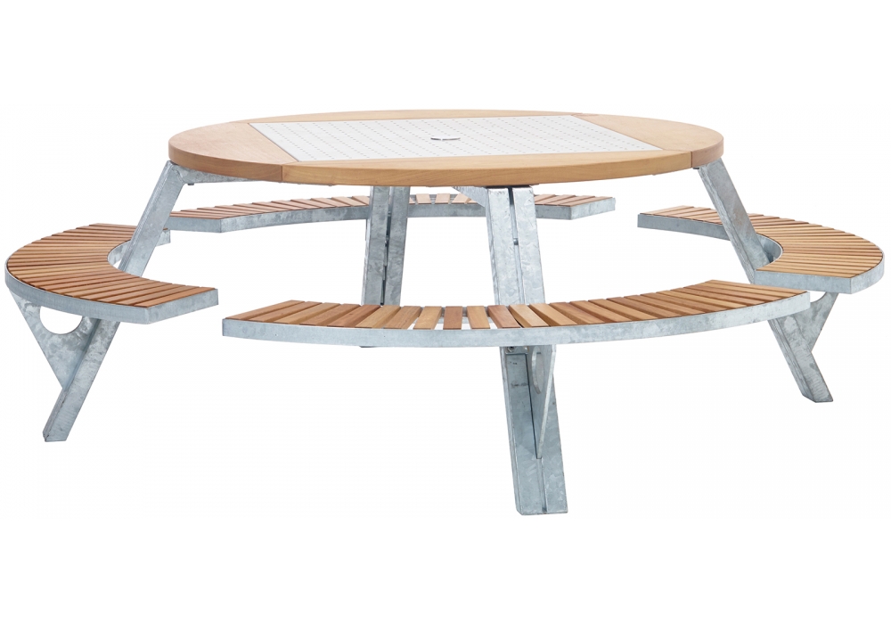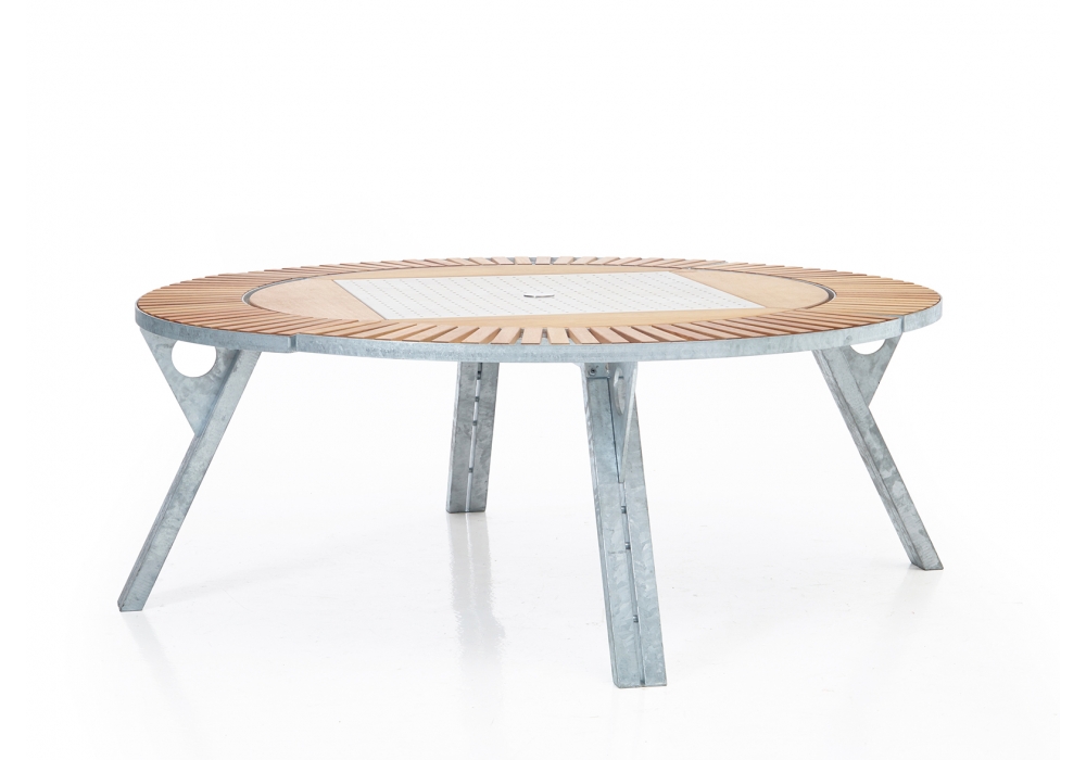 Gargantua, von Dirk Wynants für Extremis entworfen, ist einer Tisch mit verzinkte Stahlstruktur und Iroko Holzplatte. er Gargantua Tisch bietet überlegene Funktionalität dank seiner verstellbaren Bänke, die in der Höhe abhängig von sozialen oder familiären Umständen geändert werden können.