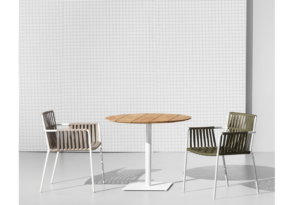 Net entworfen und hergestellt von Kettal Studio ist ein runder Esstisch mit einem Rahmen und Untergestell aus lackiertem Aluminium. Die Tischplatte ist rund und besteht aus Teakholz, Aluminium oder Marmor. Net ist in verschiedenen Ausführungen erhältlich.