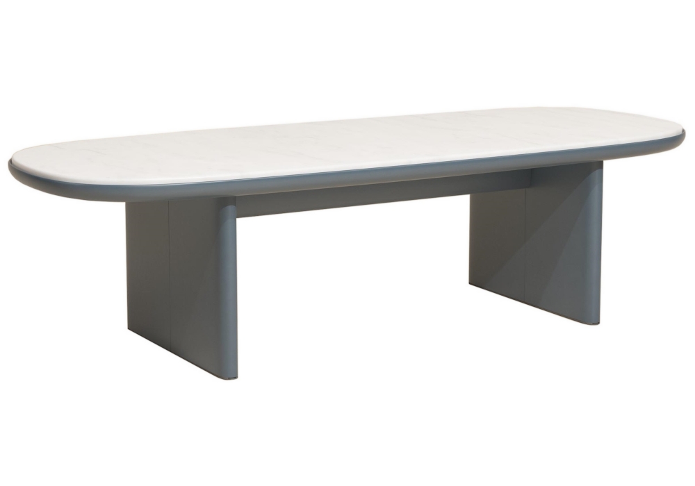 Cala von Doshi Levien für Kettal entworfen, ist ein Esstisch mit einer weißen Marmorplatte und Aluminiumbeinen.