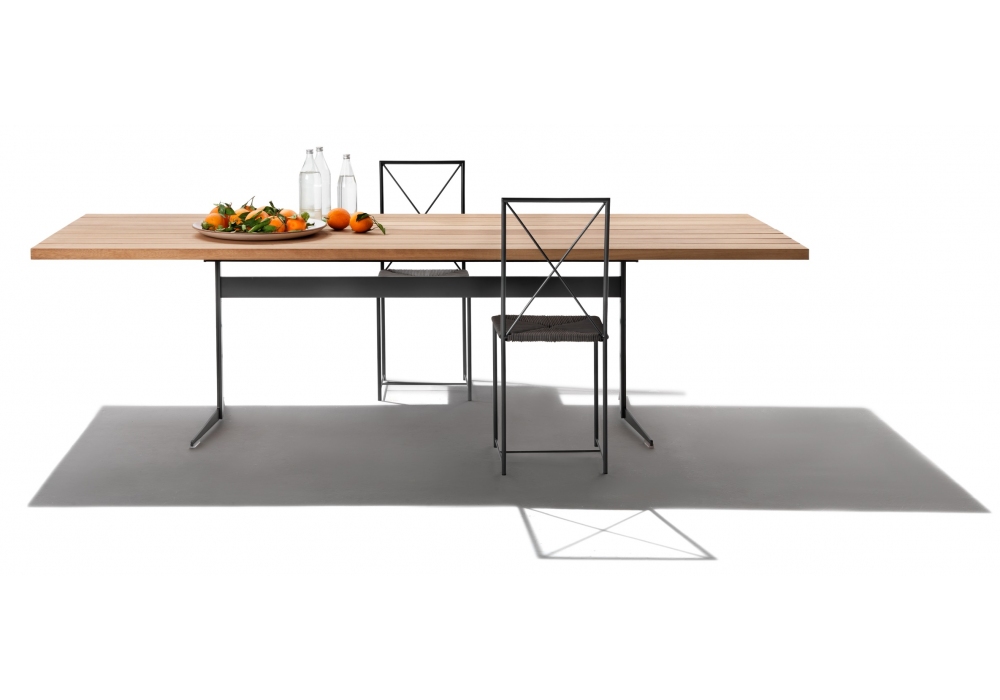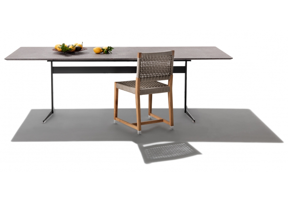 Fly Outdoor, von Antonio Citterio fur Flexform entworfen, ist ein Tisch aus der Outdoor-Kollektion. Metallgestell aus matt gebürstetem, pulverbeschichtetem oder brüniertem Finish. Steinplatte in den folgenden Ausführungen erhältlich: Lavastein, Porphyr, Pietra del Cardoso, Beola Argentata. Platte nur in einigen Abmessungen in Holz erhältlich.