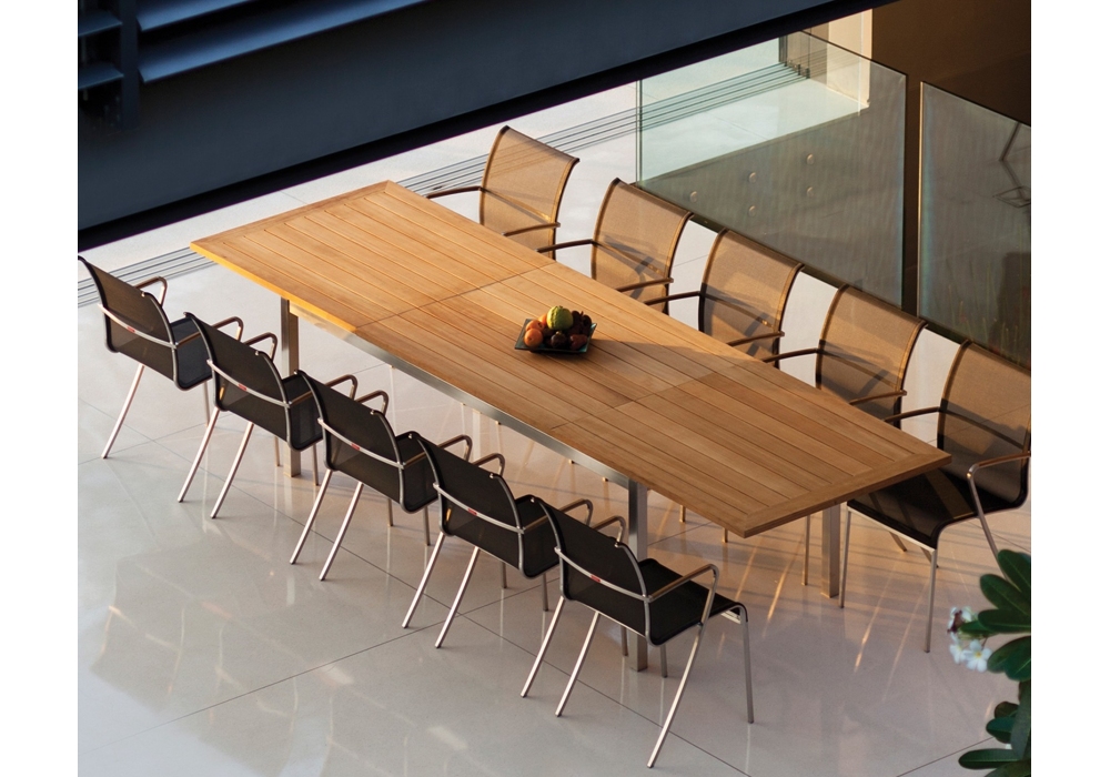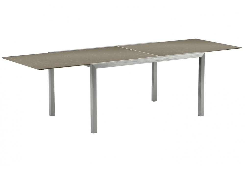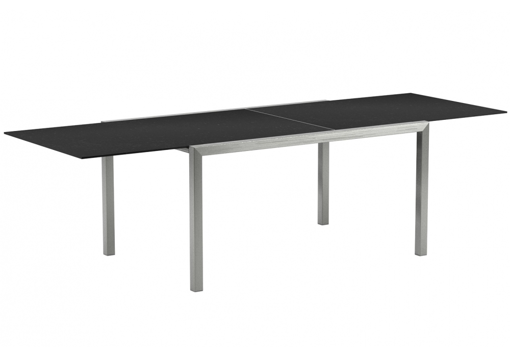 Taboela, entworfen von Kris Van Puyvelde für Royal Botania, ist ein ausziehbarer Tisch mit Edelstahlstruktur und platte aus Keramik- oder Teak. Verfügbar in verschiedenen Ausführungen.