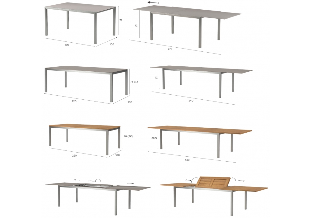 | Abmessungen | 100 x 150-270 x H 75 cm; 100 x 220-340 x H 75 cm. |