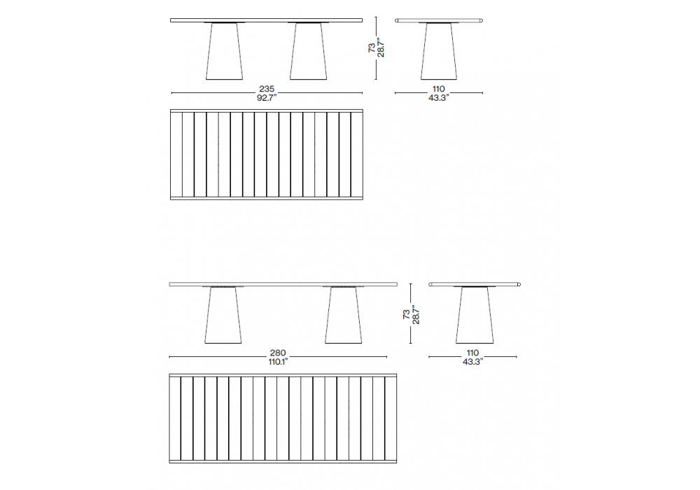 Dine Out von Rodolfo Dordoni für Cassina entworfen, ist ein rechteckiger Tisch mit 2 konischen Untergestell verfügbar in 3 Ausführungen und Platte aus Teakholz. Auch verfügbar in 2 Abmessungen.