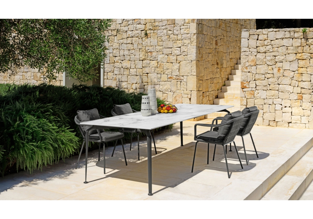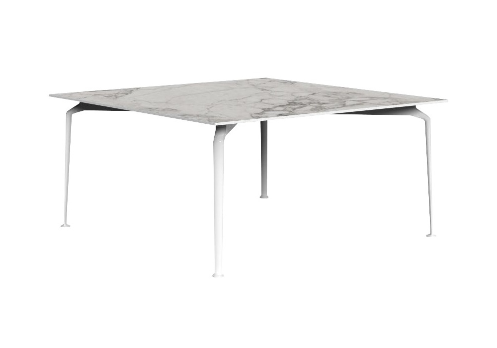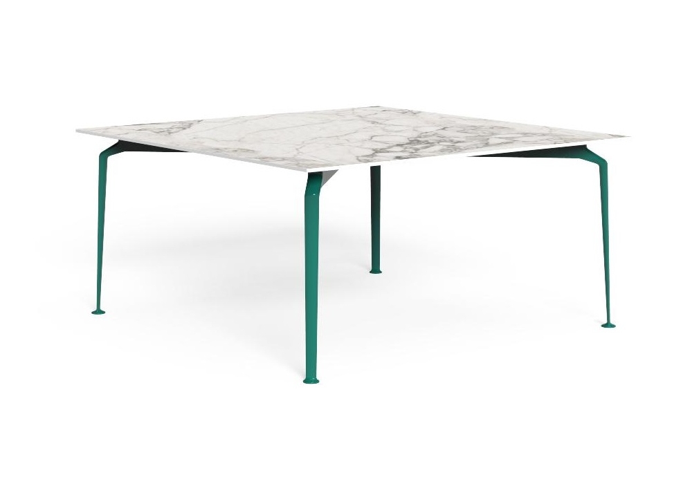 Cruise Alu, entworfen von Ludovica und Roberto Palomba für Talenti, ist ein Tisch mit Aluminiumstruktur in drei Ausführungen, Weiß, Graphit oder Aquagrün und Steinzeugplatte in 12 mm Calacatta-Ausführung. Erhältlich in drei verschiedenen Größen.