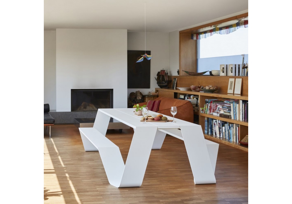 Hopper Picnic AA von Dirk Wynants für Extremis entworfen, ist ein Picknicktisch, der vollständig aus Aluminium besteht. Dank der vier Einstiegspunkte gibt es keinen Grund mehr, ständig über die Sitzbänke zu klettern und die Nachbarn zu stören. Verfügbarin mehreren Ausführungen.