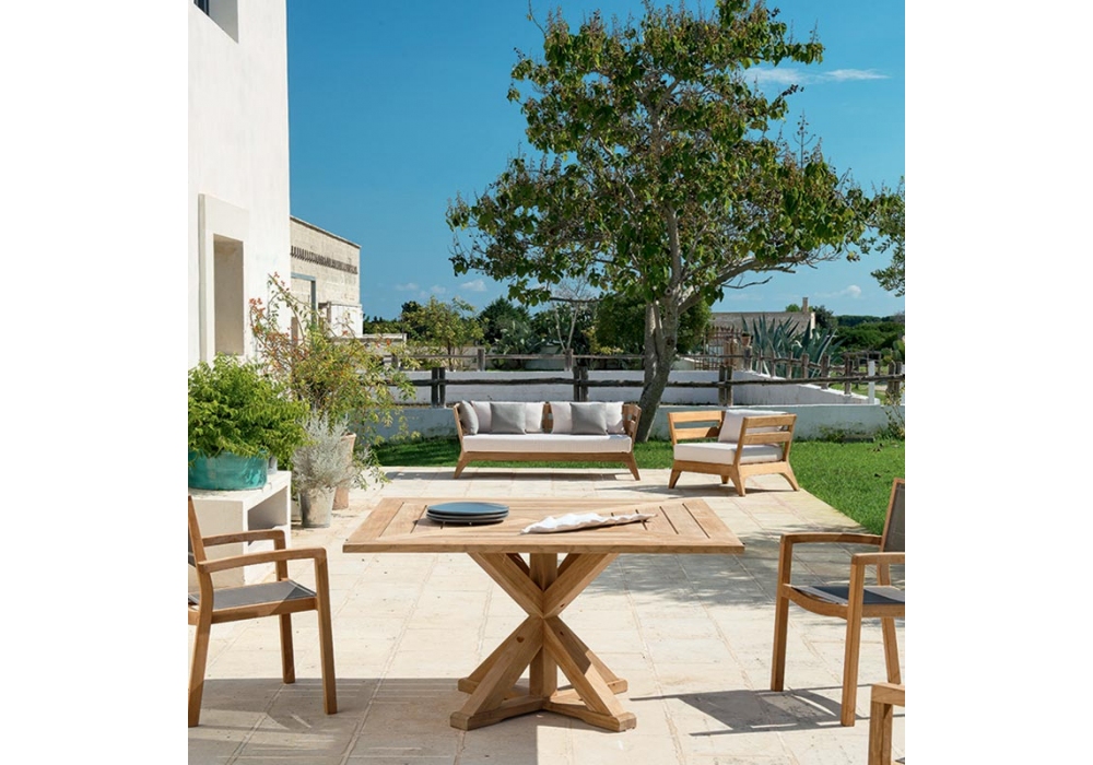 Cronos, hergestellt und signiert von Ethimo, ist ein Outdoor-Tisch, der vollständig aus Teakholz mit eingelegter Platte besteht. Cronos ist in verschiedenen Ausführungen und Modellen erhältlich.