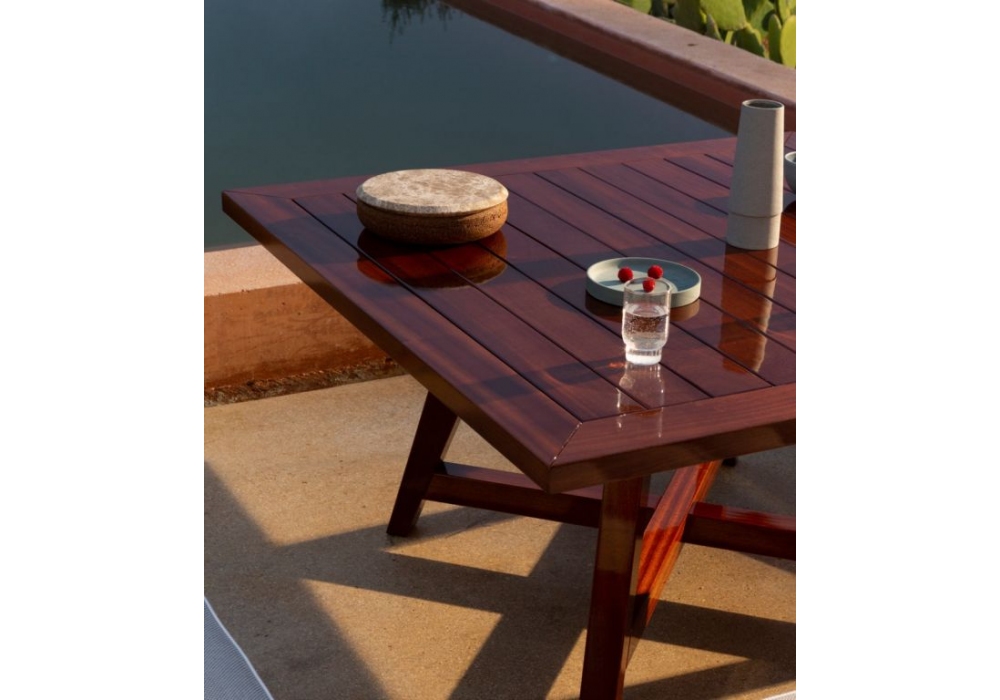 C'est la Vie, von Michele Bönan für Unopiù entworfen, ist ein viereckiger Bistrotisch für den Außenbereich. Die Struktur aus poliertem Mahagoni mit Füßen aus poliertem Edelstahl. C'est la Vie ist in verschiedenen Modellen erhältlich.