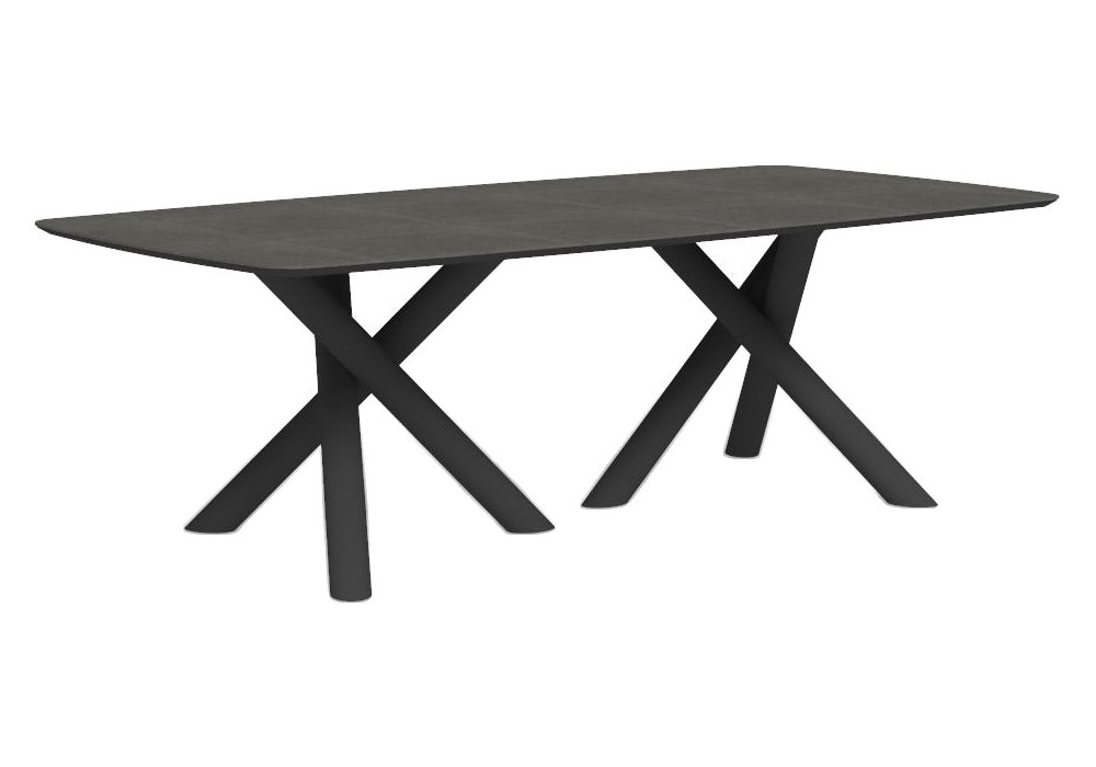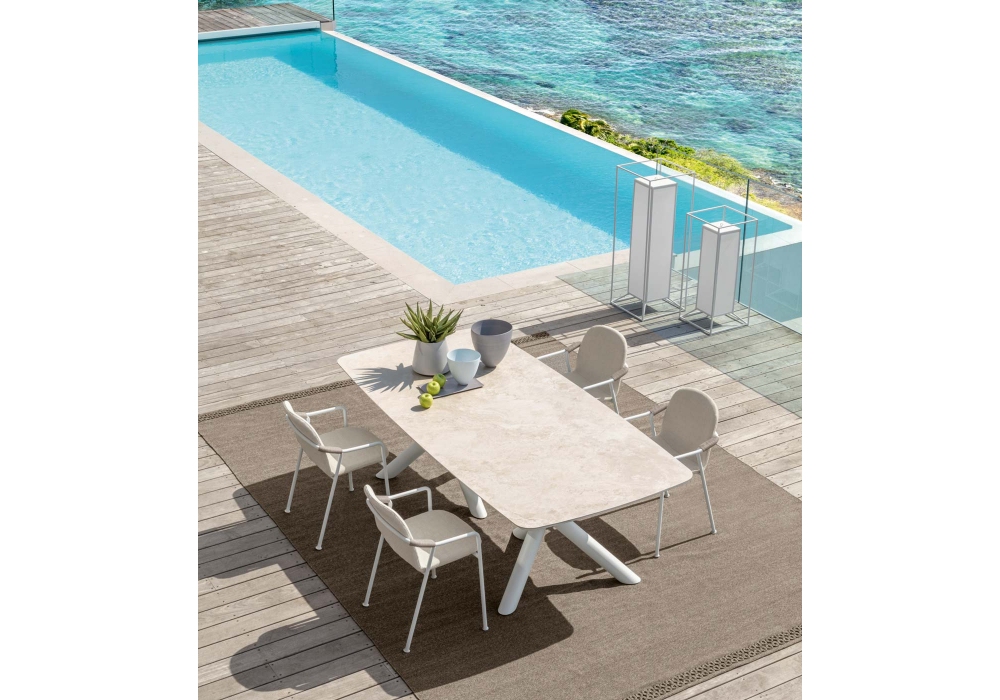 Coral, von Marco Acerbis für Talenti entworfen, ist eine Tischkollektion für den Außenbereich, die aus einer Aluminiumbasis und einer Steinzeugplatte besteht.
