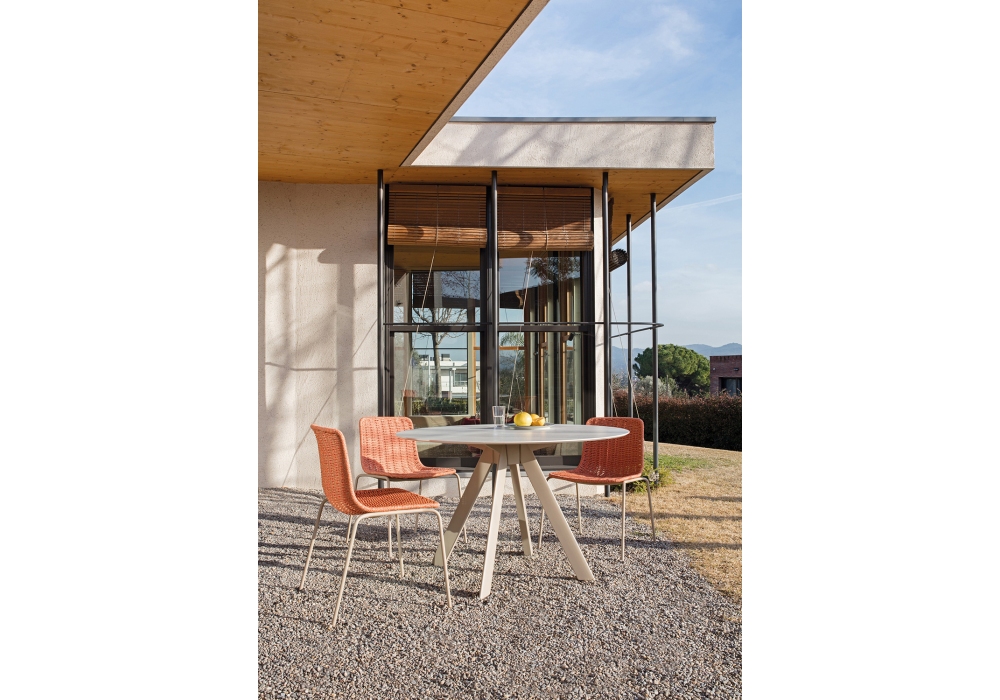 Atrivm Outdoor, von Manel Molina für Expormim entworfen, ist ein runder Tisch mit Struktur und Beinen aus hochfestem Aluminiumprofil, fertig mit Polyesterpulver oder zertifiziertem Sapelli-Holz. Erhältlich in zwei Größen.