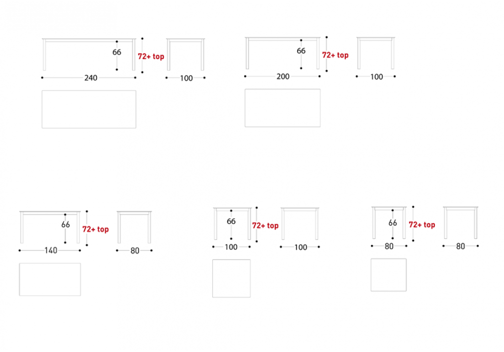 | Abmessungen | - 80 x 80 x 80 x H 72 cm; - 100 x 100 x H 72 cm; - 140 x 80 x H 72 cm; - 200 x 100 x H 72 cm; - 240 x 100 x H 72 cm. |
