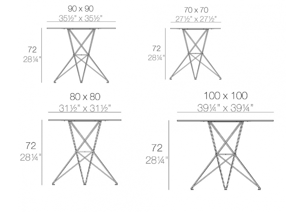 | Tischplatte | 70 x 70 cm; 80 x 80 cm; 90 x 90 cm; 100 x 100 cm. |