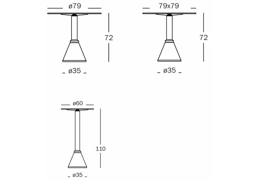 | Abmessungen | Ø 79 x H 72 cm; 79 x 79 x H 79 cm; Ø 60 x H 110 cm. |