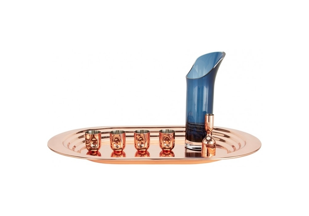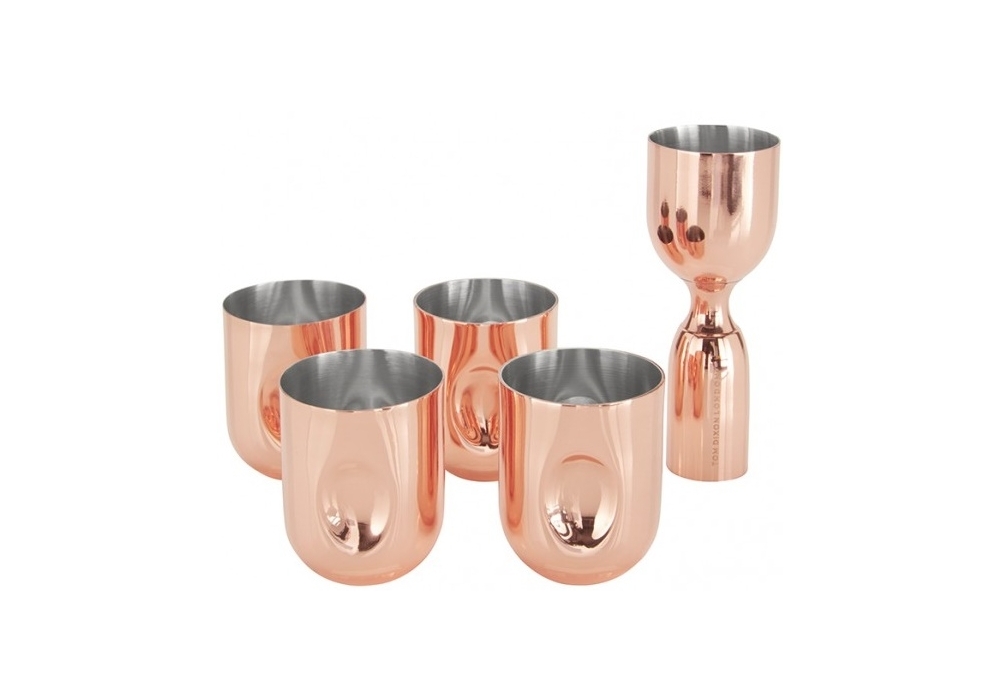 Plum Shot Giftset von Tom Dixon entworfen, ist ein Set bestehend aus vier Schnapsgläsern und einem Messbecher aus massivem Stahl in glänzendem Kupfer-Finish.