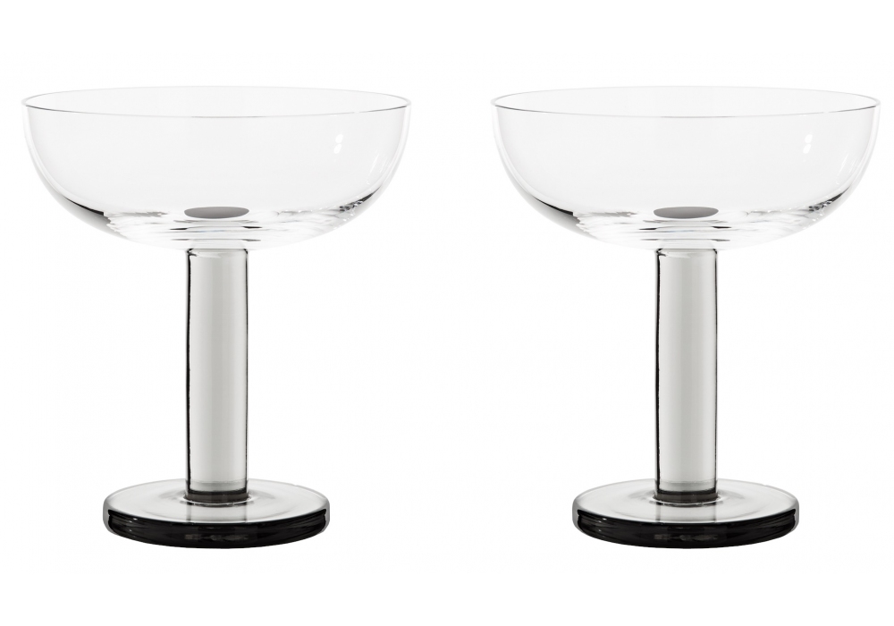 Puck Coupe von Tom Dixon entworfen, ist ein Set bestehend aus zwei Bechern aus mundgeblasenem Glas mit einem hellen Rauchton.