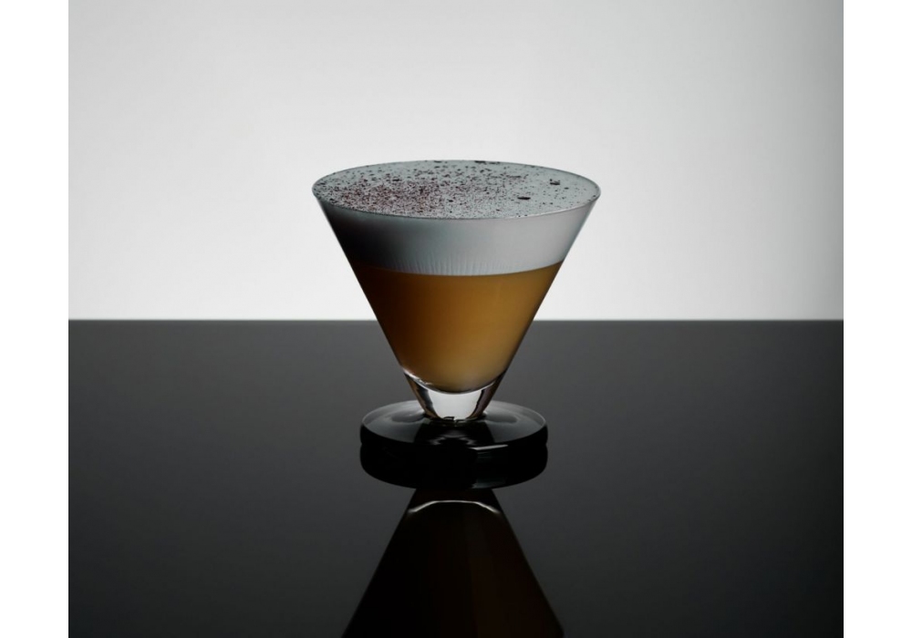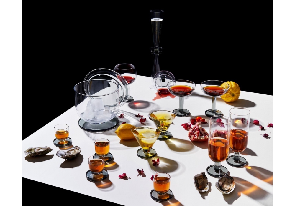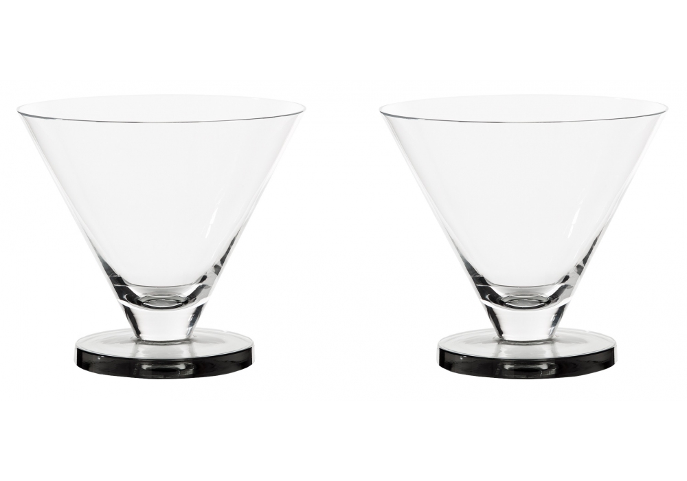 Puck von Tom Dixon entworfen, ist ein Set bestehend aus zwei Cocktailgläsern aus mundgeblasenem Glas mit einem hellen Rauchton.