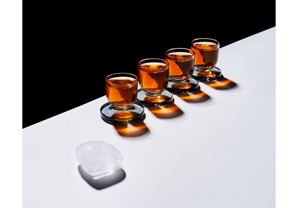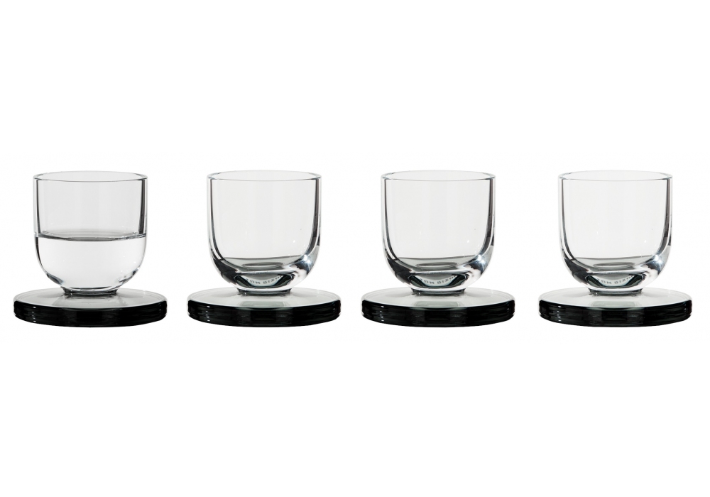 Punk von Tom Dixon entworfen, ist ein Set bestehend aus vier Schnapsgläsern aus mundgeblasenem Glas mit einem hellen Rauchfarbton.