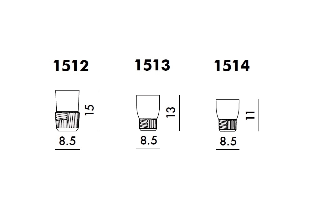 | Abmessungen | ⌀ 8,5 x H 11 cm; ⌀ 8,5 x H 13 cm; ⌀ 8,5 x H 15 cm. |
