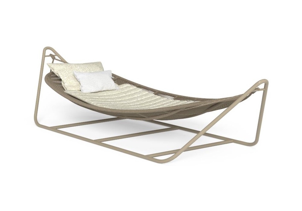Panama, entworfen von Ludovica und Roberto Palomba für Talenti, ist eine Hängematte mit Aluminiumstruktur und synthetischem Seeseil, erhältlich in verschiedenen Farben, Kissen in verschiedenen Ausführungen.