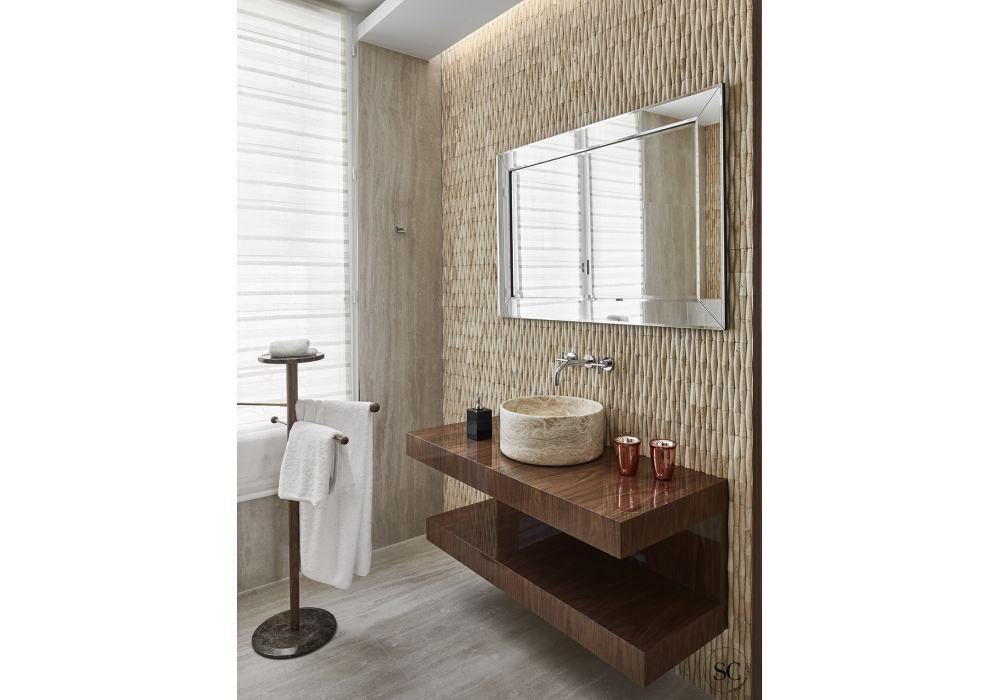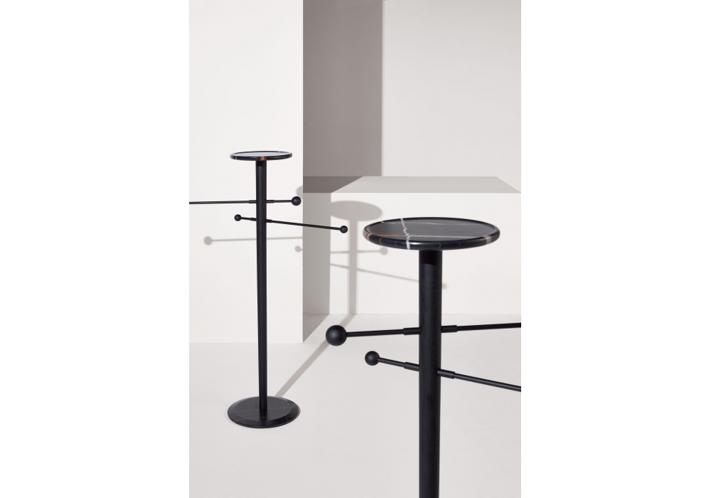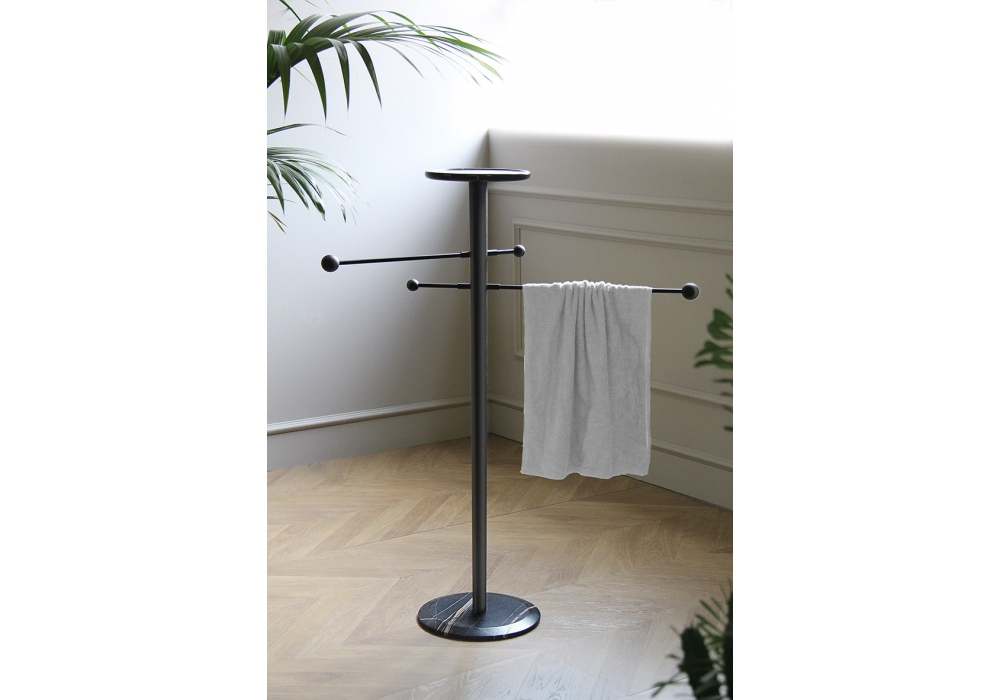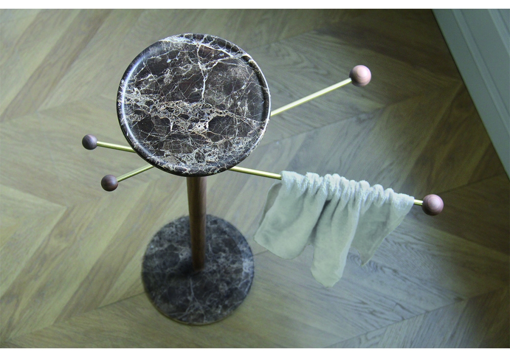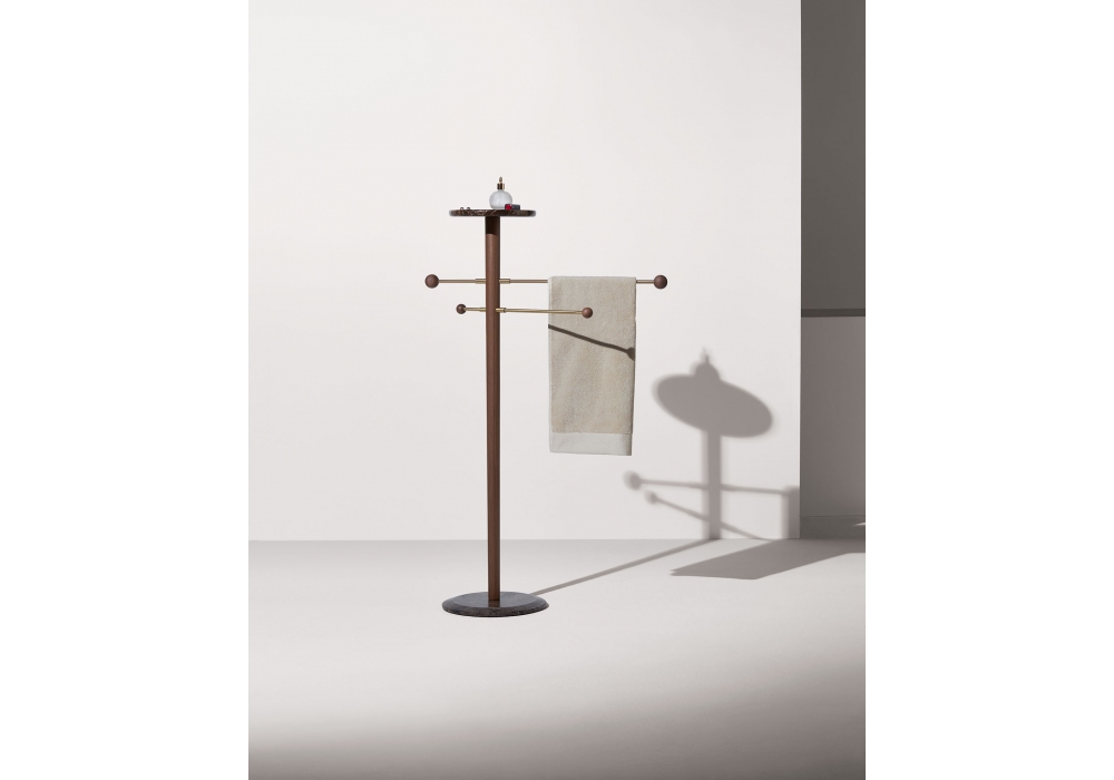 Toallero von Andrés Martinez für Nomon entworfen, ist ein Handtuchhalter mit Struktur aus Nussbaum oder schwarzer Esche, Details aus poliertem oder schwarz lackiertem Messing. Der Sockel ist aus Marmor Emperador oder Sahara Noir.
